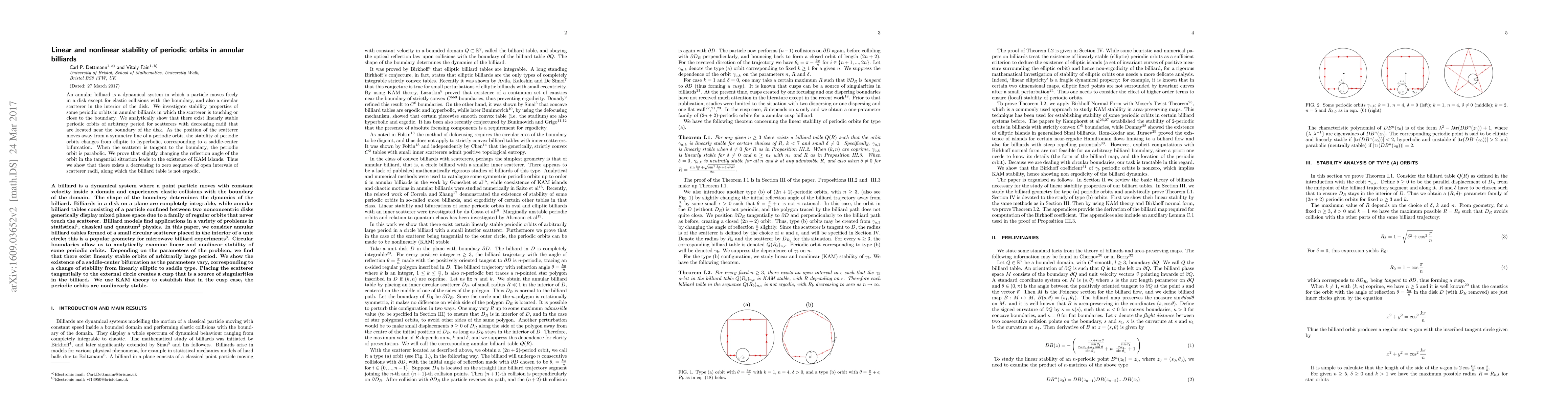 This paper investigates the stability of periodic orbits in annular billiards where a scatterer touches or is near the boundary. It demonstrates the existence of linearly stable orbits with varying periods and shows how stability changes from elliptic to hyperbolic as the scatterer moves away from symmetry lines, leading to KAM islands and non-ergodic regions.