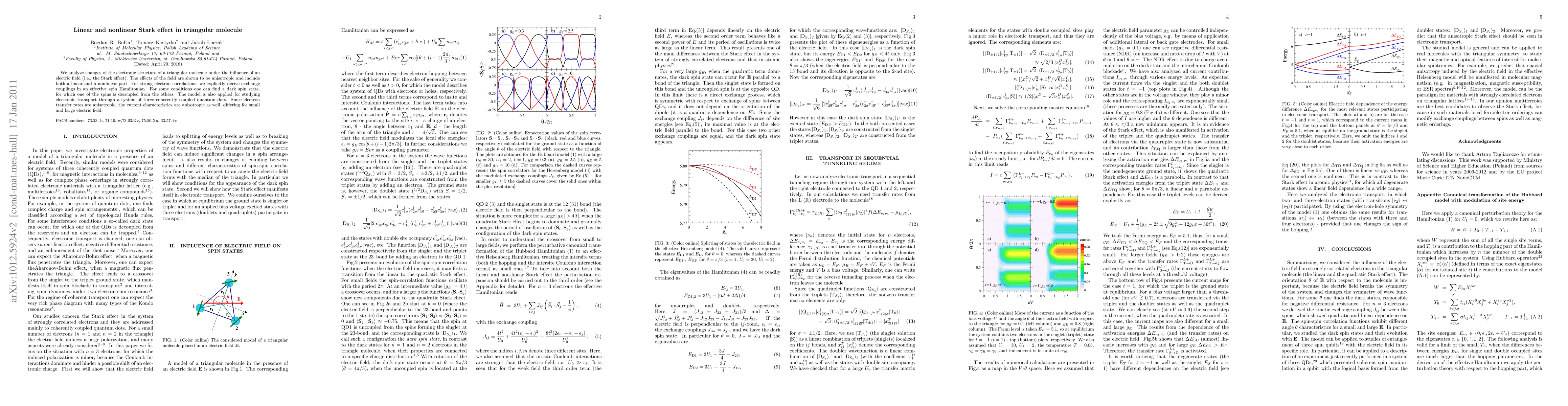 We analyze changes of the electronic structure of a triangular molecule under the influence of an electric field (i.e., the Stark effect). The effects of the field are shown to be anisotropic and include both a linear and a nonlinear part. For strong electron correlations, we explicitly derive exchange couplings in an effective spin Hamiltonian. For some conditions one can find a dark spin state, for which one of the spins is decoupled from the others. The model is also applied for studying electronic transport through a system of three coherently coupled quantum dots. Since electron transfer rates are anisotropic, the current characteristics are anisotropic as well, differing for small and large electric field.