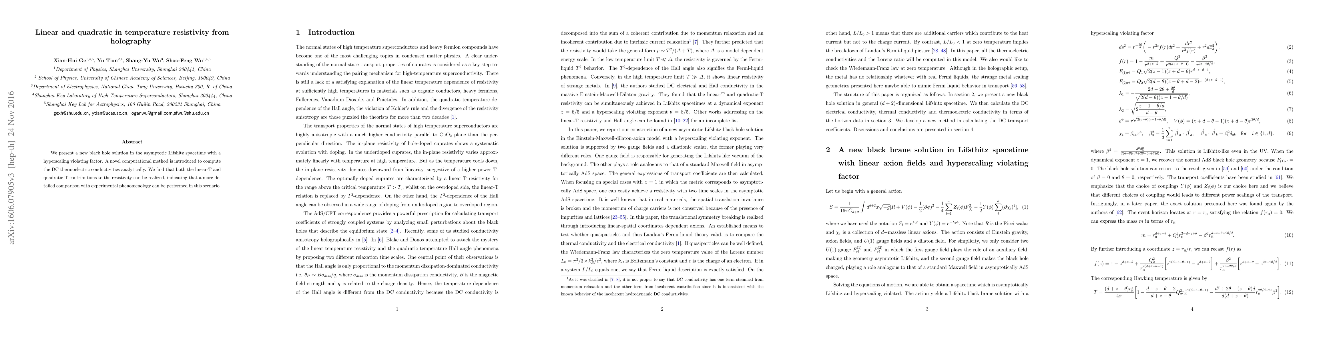 We present a new black hole solution in the asymptotic Lifshitz spacetime with a hyperscaling violating factor. A novel computational method is introduced to compute the DC thermoelectric conductivities analytically. We find that both the linear-T and quadratic-T contributions to the resistivity can be realized, indicating that a more detailed comparison with experimental phenomenology can be performed in this scenario.