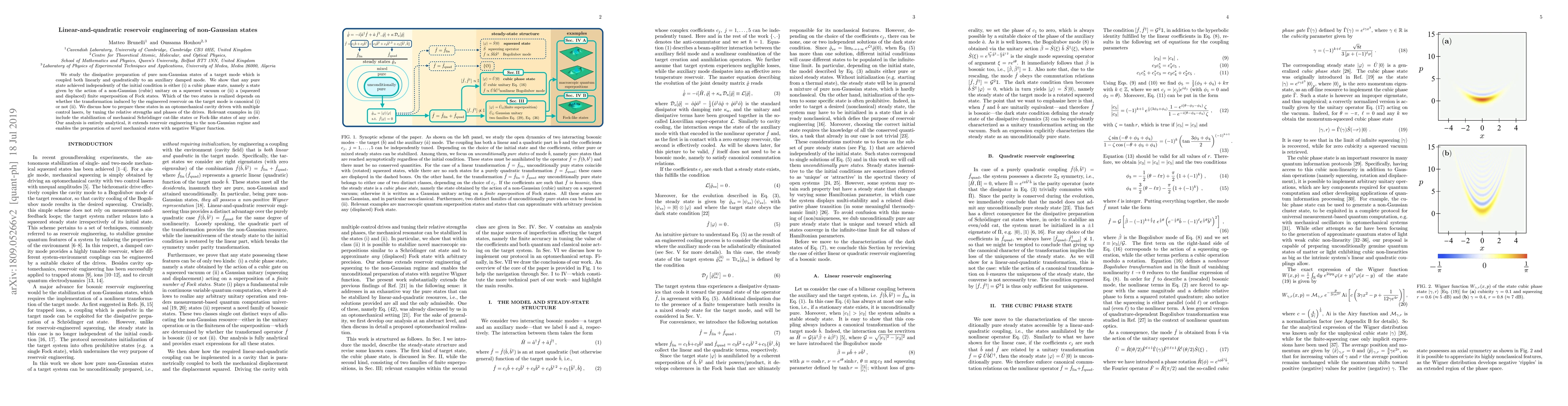 This paper investigates the preparation of pure non-Gaussian states in a coupled optomechanical system through linear-and-quadratic reservoir engineering. It reveals that the resulting states are either cubic phase states or finite superpositions of Fock states, depending on the nature of the induced transformation.