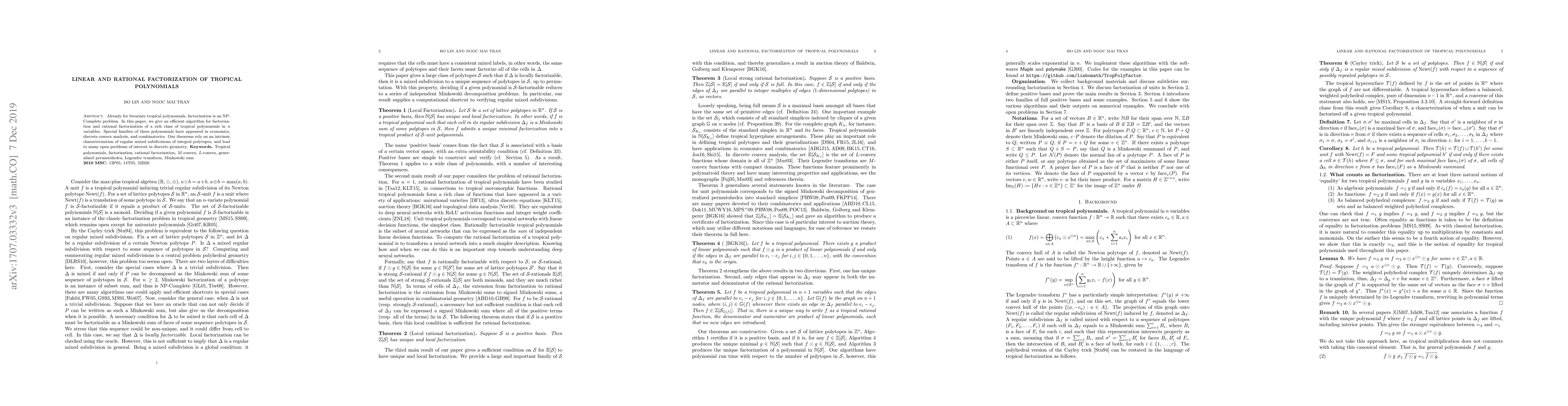 Already for bivariate tropical polynomials, factorization is an NP-Complete problem. In this paper, we give an efficient algorithm for factorization and rational factorization of a rich class of tropical polynomials in $n$ variables. Special families of these polynomials have appeared in economics, discrete convex analysis, and combinatorics. Our theorems rely on an intrinsic characterization of regular mixed subdivisions of integral polytopes, and lead to many open problems of interest in discrete geometry.