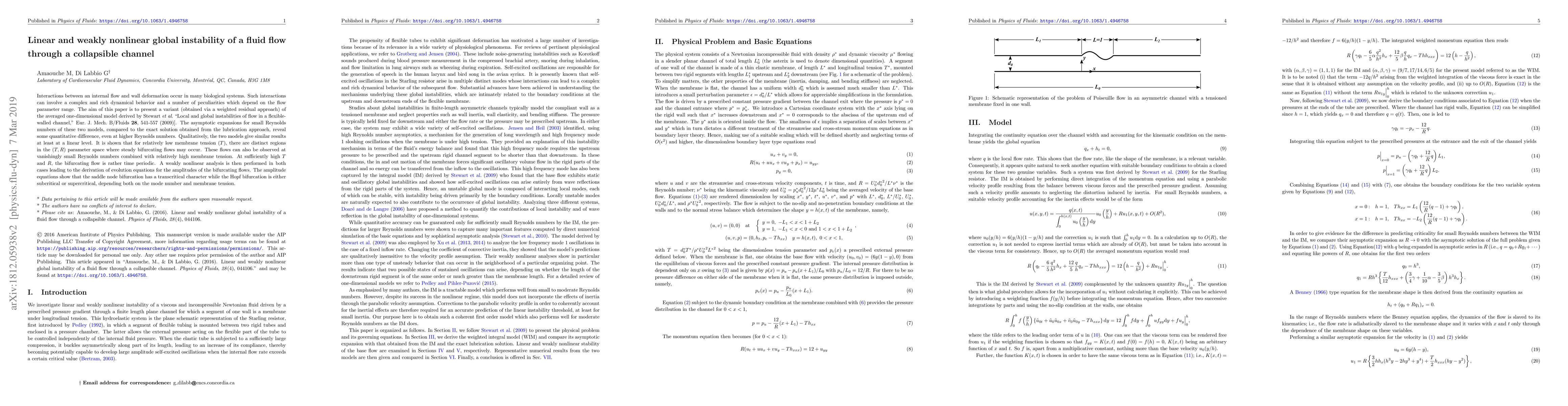 Interactions between an internal flow and wall deformation occur in many biological systems. Such interactions can involve a complex and rich dynamical behavior and a number of peculiarities which depend on the flow parameter range. The aim of this paper is to present a variant (obtained via a weighted residual approach) of the averaged one-dimensional model derived by Stewart et al. "Local and global instabilities of flow in a flexible-walled channel," Eur. J. Mech. B/Fluids 28, 541-557 (2009)]. The asymptotic expansions for small Reynolds numbers of these two models, compared to the exact solution obtained from the lubrication approach, reveal some quantitative difference, even at higher Reynolds numbers. Qualitatively, the two models give similar results at least at a linear level. It is shown that for relatively low membrane tension (T), there are distinct regions in the (T,R) parameter space where steady bifurcating flows may occur. These flows can also be observed at vanishingly small Reynolds numbers combined with relatively high membrane tension. At sufficiently high T and R, the bifurcating flow is rather time periodic. A weakly nonlinear analysis is then performed in both cases leading to the derivation of evolution equations for the amplitudes of the bifurcating flows. The amplitude equations show that the saddle node bifurcation has a transcritical character while the Hopf bifurcation is either subcritical or supercritical, depending both on the mode number and membrane tension.