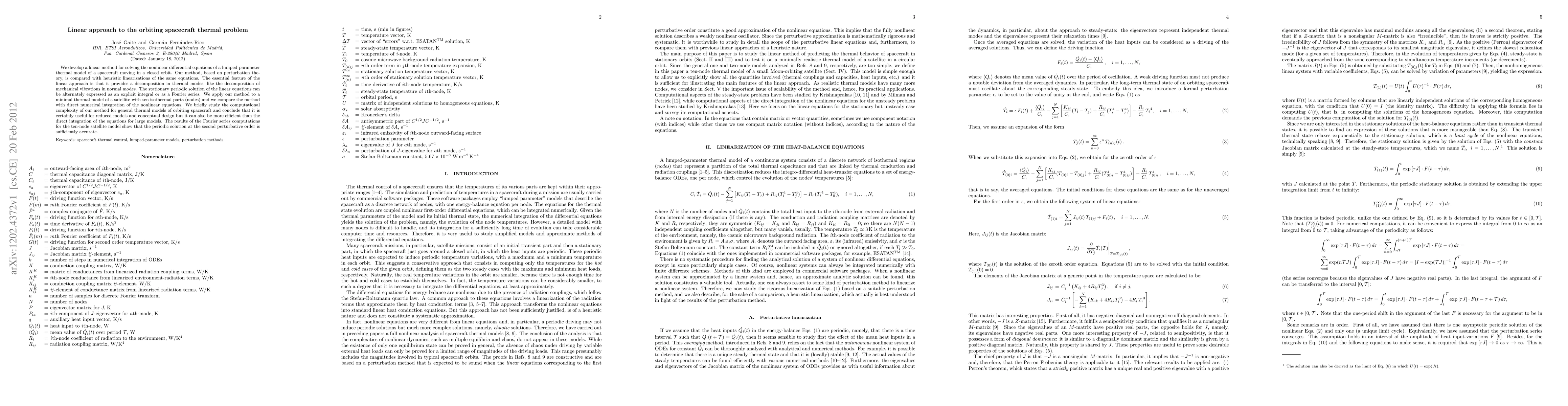 We develop a linear method for solving the nonlinear differential equations of a lumped-parameter thermal model of a spacecraft moving in a closed orbit. Our method, based on perturbation theory, is compared with heuristic linearizations of the same equations. The essential feature of the linear approach is that it provides a decomposition in thermal modes, like the decomposition of mechanical vibrations in normal modes. The stationary periodic solution of the linear equations can be alternately expressed as an explicit integral or as a Fourier series. We apply our method to a minimal thermal model of a satellite with ten isothermal parts (nodes) and we compare the method with direct numerical integration of the nonlinear equations. We briefly study the computational complexity of our method for general thermal models of orbiting spacecraft and conclude that it is certainly useful for reduced models and conceptual design but it can also be more efficient than the direct integration of the equations for large models. The results of the Fourier series computations for the ten-node satellite model show that the periodic solution at the second perturbative order is sufficiently accurate.