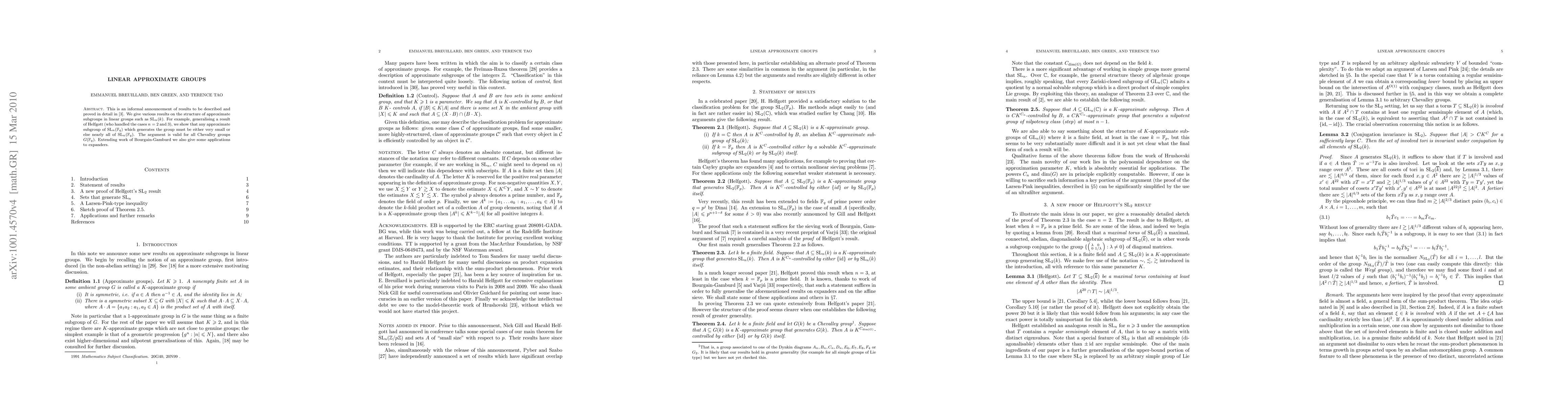 This is an informal announcement of results to be described and proved in detail in a paper to appear. We give various results on the structure of approximate subgroups in linear groups such as $\SL_n(k)$. For example, generalising a result of Helfgott (who handled the cases $n = 2$ and 3), we show that any approximate subgroup of $\SL_n(\F_q)$ which generates the group must be either very small or else nearly all of $\SL_n(\F_q)$. The argument is valid for all Chevalley groups $G(\F_q)$.