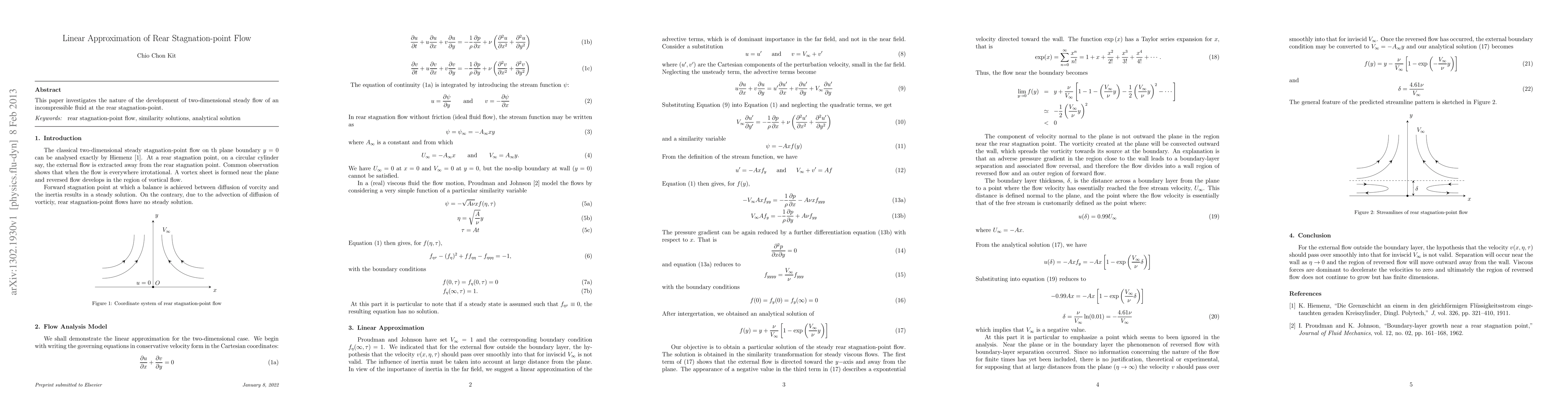 Summary: This research explores the linear approximation of two-dimensional, steady, incompressible fluid flow at the rear stagnation-point, focusing on the flow development characteristics. The study aims to provide a detailed understanding of the fluid dynamics in this specific region.