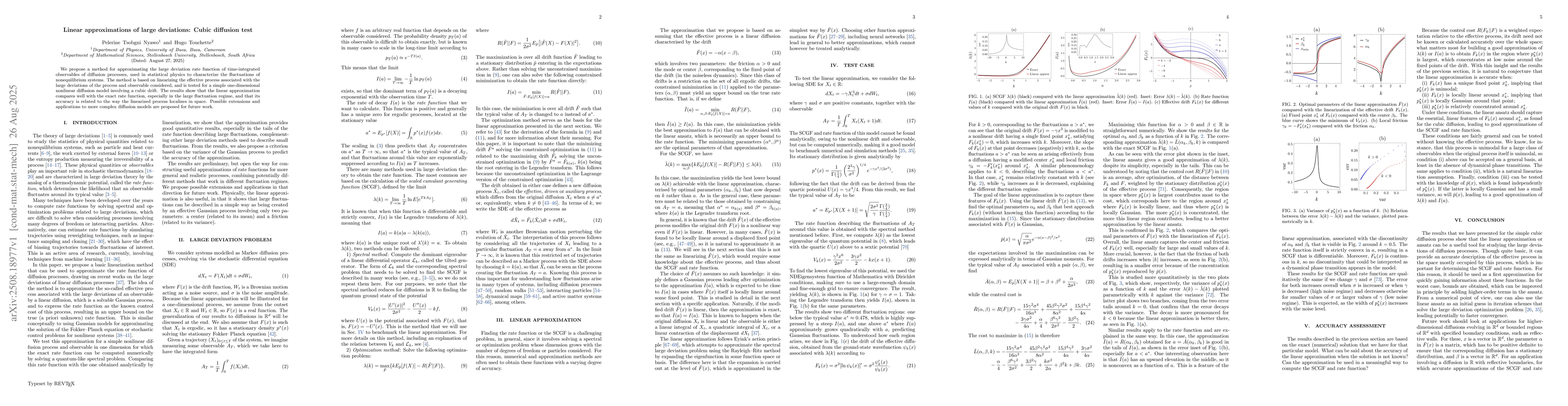 We propose a method for approximating the large deviation rate function of time-integrated observables of diffusion processes, used in statistical physics to characterize the fluctuations of nonequilibrium systems. The method is based on linearizing the effective process associated with the large deviations of the process and observable considered, and is tested for a simple one-dimensional nonlinear diffusion model involving a cubic drift. The results show that the linear approximation compares well with the exact rate function, especially in the large fluctuation regime, and that its accuracy is related to the way the linearized process localizes in space. Possible extensions and applications to more complex diffusion models are proposed for future work.