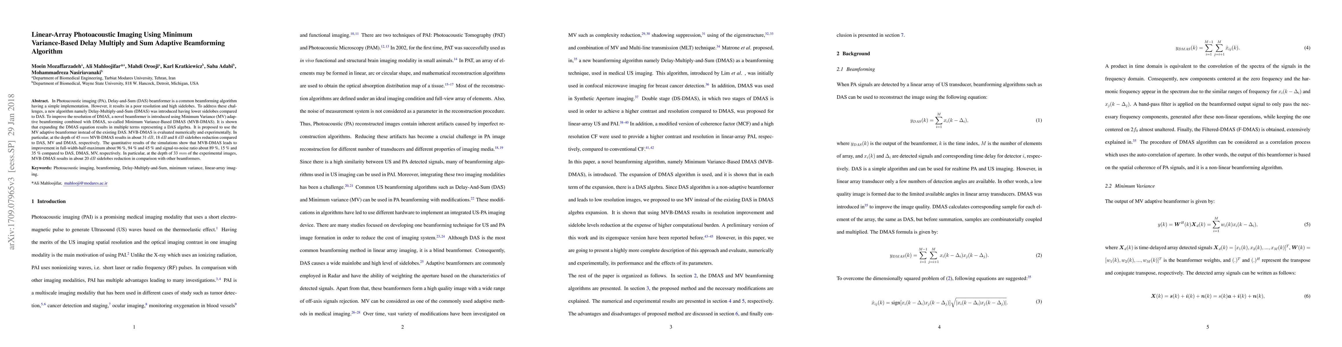 This paper introduces a Minimum Variance-Based Delay-Multiply-and-Sum (MVB-DMAS) adaptive beamforming algorithm for linear-array photoacoustic imaging, which significantly reduces sidelobes and improves resolution compared to traditional Delay-and-Sum (DAS) and other methods. Experimental and numerical evaluations show substantial improvements in sidelobe levels, resolution, and signal-to-noise ratio.