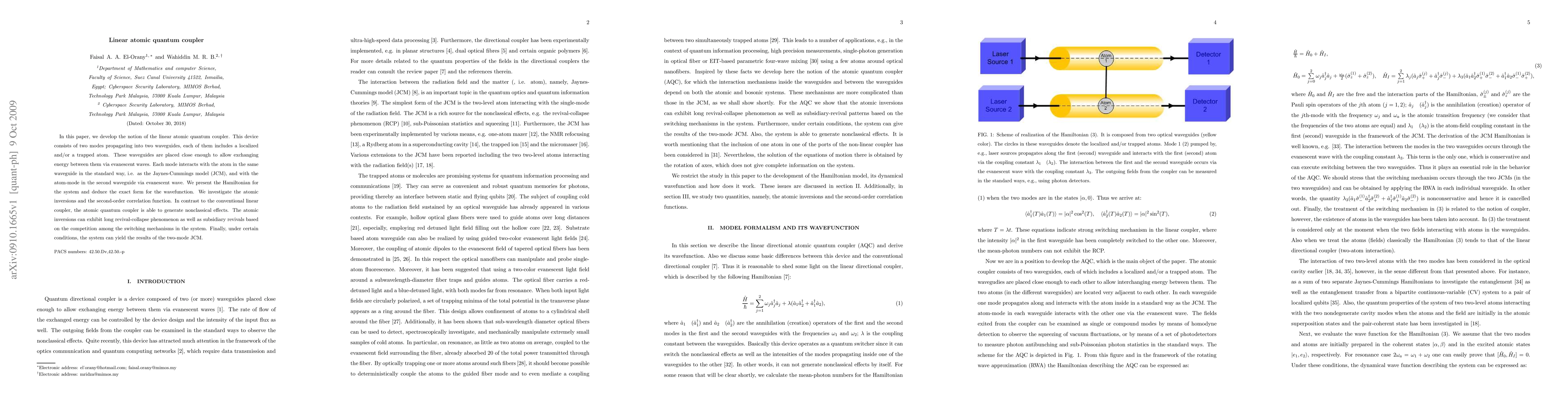 This paper introduces the Linear Atomic Quantum Coupler, a device with two waveguides housing atoms interacting via evanescent waves. Unlike conventional couplers, it generates nonclassical effects, exhibits long revival-collapse phenomena, and can emulate the two-mode Jaynes-Cummings model under specific conditions.