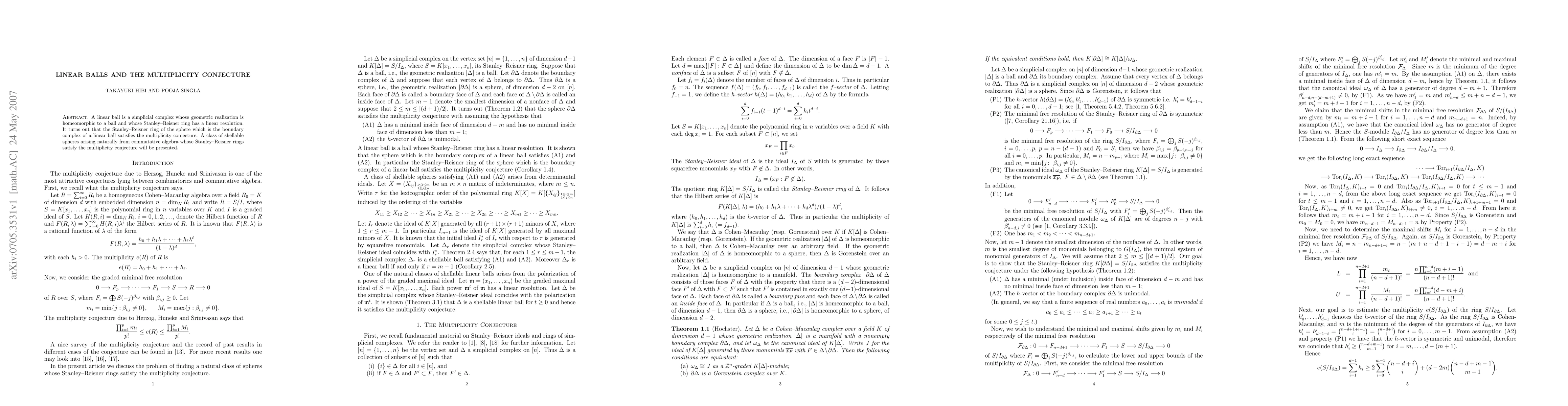 This paper explores linear balls, simplicial complexes homeomorphic to a ball with linear resolution Stanley-Reisner rings, and demonstrates that their boundary sphere complexes satisfy the multiplicity conjecture. It also introduces a class of shellable spheres from commutative algebra with the same property.