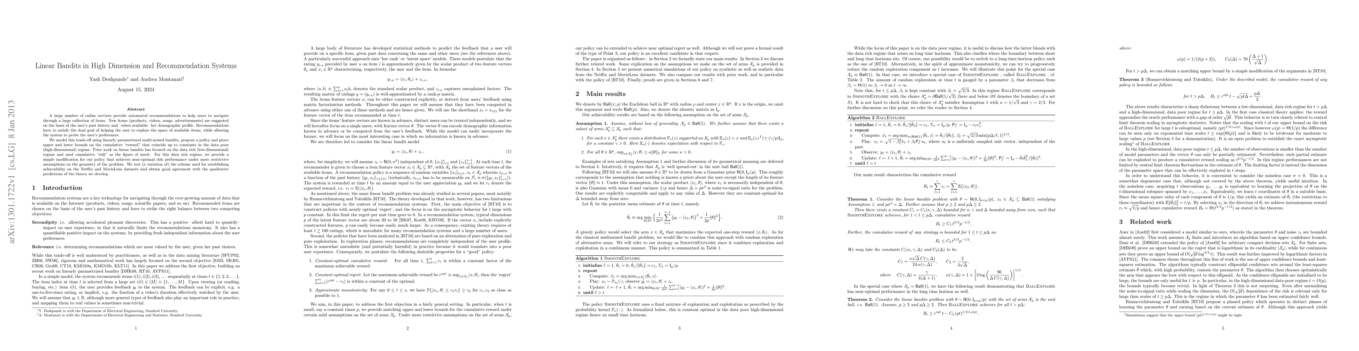 A large number of online services provide automated recommendations to help users to navigate through a large collection of items. New items (products, videos, songs, advertisements) are suggested on the basis of the user's past history and --when available-- her demographic profile. Recommendations have to satisfy the dual goal of helping the user to explore the space of available items, while allowing the system to probe the user's preferences. We model this trade-off using linearly parametrized multi-armed bandits, propose a policy and prove upper and lower bounds on the cumulative "reward" that coincide up to constants in the data poor (high-dimensional) regime. Prior work on linear bandits has focused on the data rich (low-dimensional) regime and used cumulative "risk" as the figure of merit. For this data rich regime, we provide a simple modification for our policy that achieves near-optimal risk performance under more restrictive assumptions on the geometry of the problem. We test (a variation of) the scheme used for establishing achievability on the Netflix and MovieLens datasets and obtain good agreement with the qualitative predictions of the theory we develop.