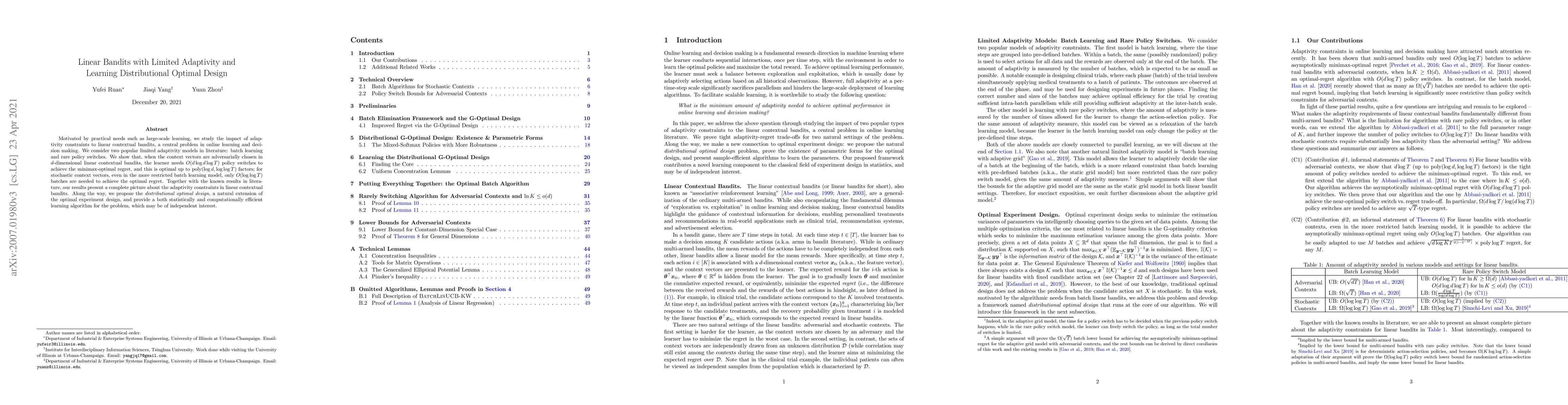This paper investigates the impact of adaptivity constraints on linear contextual bandits, showing that limited adaptivity models like batch learning and rare policy switches are optimal for achieving minimax-optimal regret under adversarial and stochastic context vectors. It also introduces a distributional optimal design and an efficient learning algorithm.