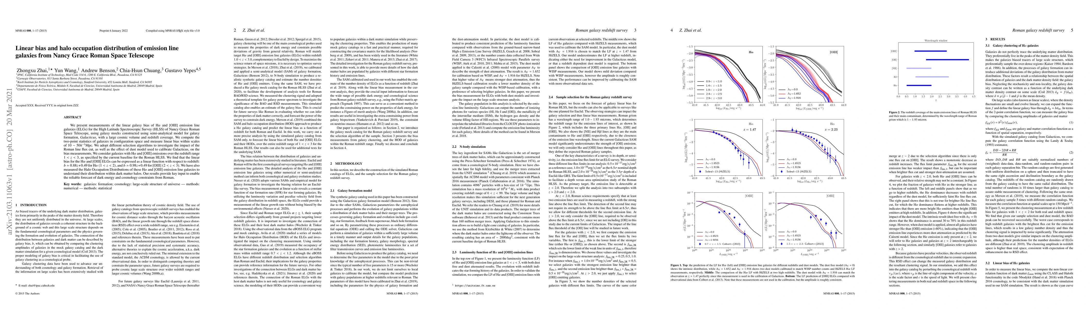 This paper measures the linear bias and Halo Occupation Distribution (HOD) of H$\alpha$ and [OIII] emission line galaxies from the Nancy Grace Roman Space Telescope's High Latitude Spectroscopic Survey. The study finds linear bias functions for H$\alpha$ and [OIII] ELGs and provides insights into their distribution within dark matter halos, aiding in forecasting dark energy and cosmology constraints.