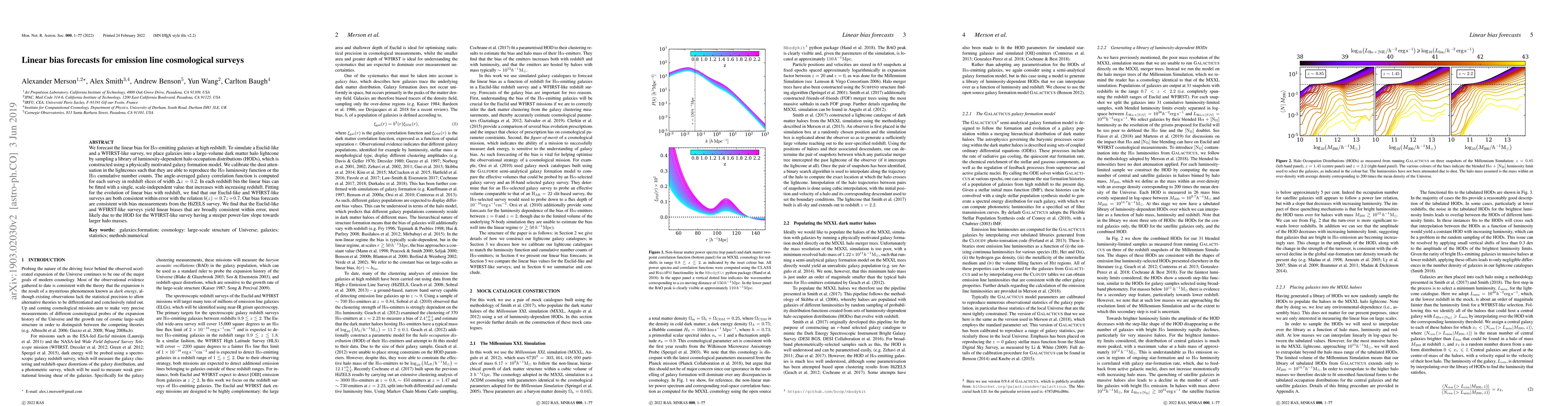 The paper forecasts linear bias for H${ m eta}$-emitting galaxies in high-redshift surveys like Euclid and WFIRST, finding that both are consistent with the relation $b(z) = 0.7z + 0.7$.
