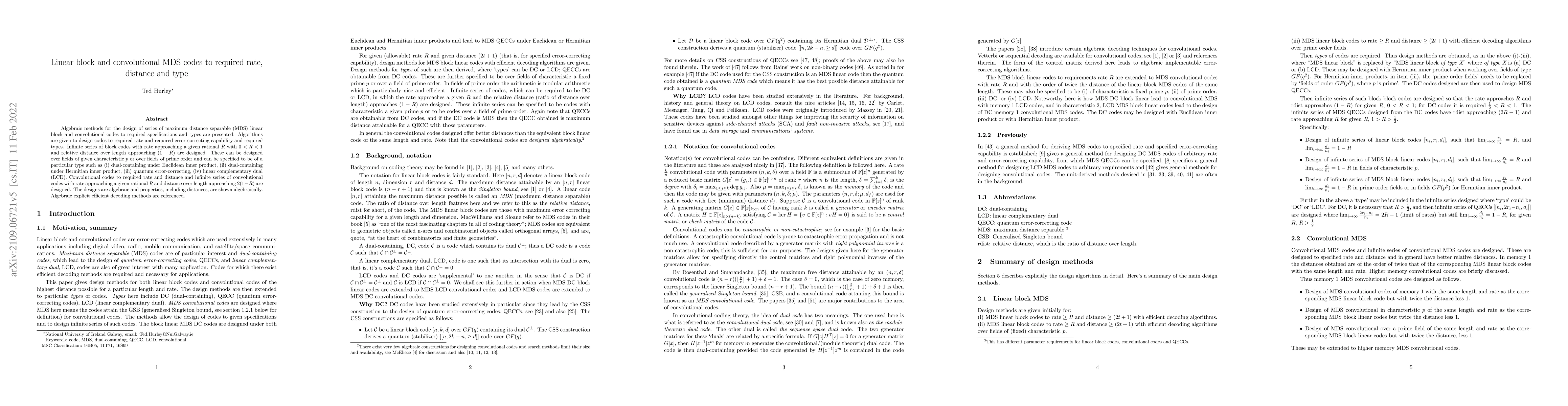 (MDS) linear block and convolutional codes to required specifications and types