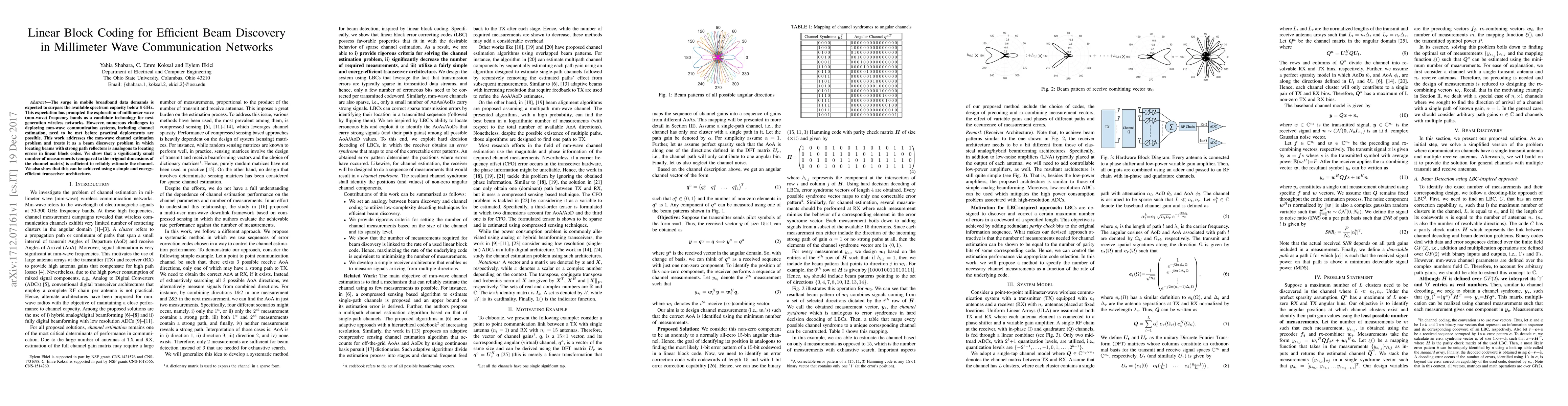 The surge in mobile broadband data demands is expected to surpass the available spectrum capacity below 6 GHz. This expectation has prompted the exploration of millimeter wave (mm-wave) frequency bands as a candidate technology for next generation wireless networks. However, numerous challenges to deploying mm-wave communication systems, including channel estimation, need to be met before practical deployments are possible. This work addresses the mm-wave channel estimation problem and treats it as a beam discovery problem in which locating beams with strong path reflectors is analogous to locating errors in linear block codes. We show that a significantly small number of measurements (compared to the original dimensions of the channel matrix) is sufficient to reliably estimate the channel. We also show that this can be achieved using a simple and energy-efficient transceiver architecture.