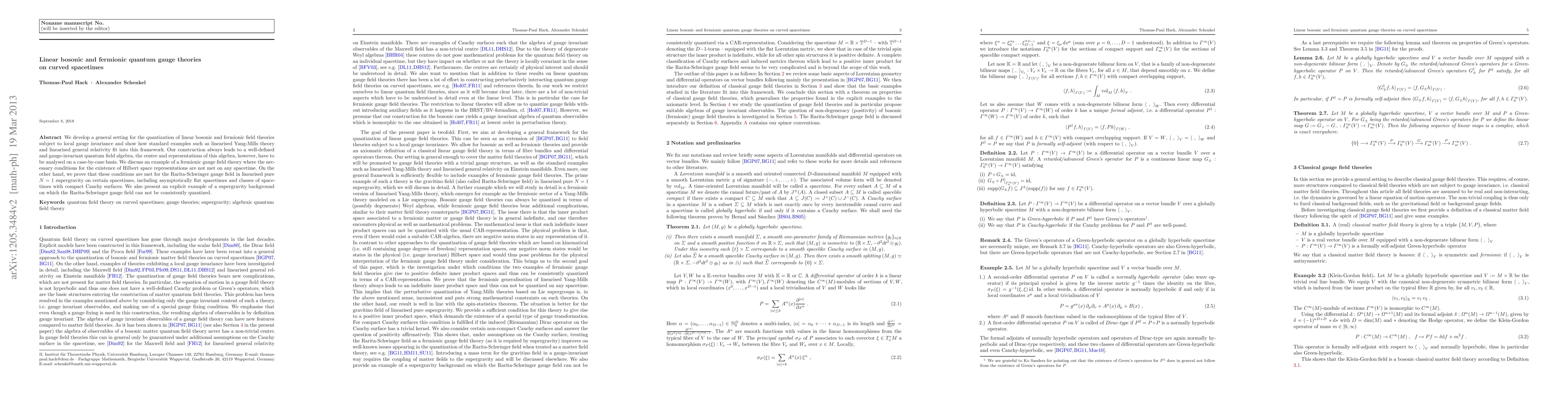 This paper develops a framework for quantizing linear bosonic and fermionic gauge theories on curved spacetimes, showing that while the construction yields a well-defined quantum field algebra, specific conditions for Hilbert space representations must be met on a case-by-case basis. It highlights an example where such conditions fail universally, but proves they are met for the Rarita-Schwinger field in certain supergravity contexts.