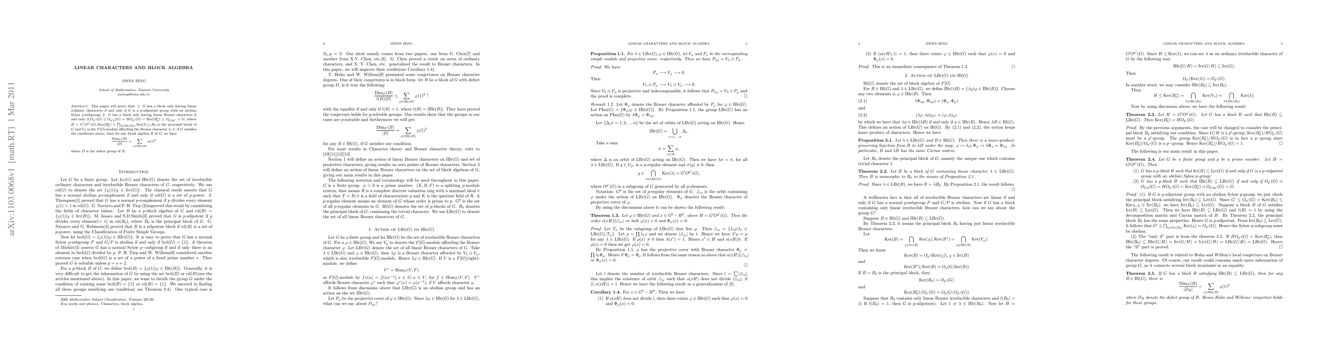 This paper will prove that: 1. $G$ has a block only having linear ordinary characters if and only if $G$ is a $p$-nilpotent group with an abelian Sylow $p$-subgroup; 2. $G$ has a block only having linear Brauer characters if and only if $O_{p'}(G)\leq O_{p'p}(G)=HO_{p'}(G)= \textrm{Ker}(B_{0}^{*}) \leq O_{p'pp'}=G$, where $H=G^{'}O^{p'}(G), \textrm{Ker}(B_{0}^{*})=\bigcap_{\lambda \in \textrm{IBr}(B_{0})} \textrm{Ker}(V_{\lambda}), B_{0}$ is the principal block of $G$ and $V_{\lambda}$ is the $F[G]$-module affording the Brauer character $\lambda$; 3. if $G$ satisfies the conditions above, then for any block algebra $B$ of $G$, we have $$ \frac{\textrm{Dim}_{F}(B)}{|D|}= \sum_{\phi \in \textrm{IBr}(B)}\phi(1)^{2}$$ where $D$ is the defect group of $B$.