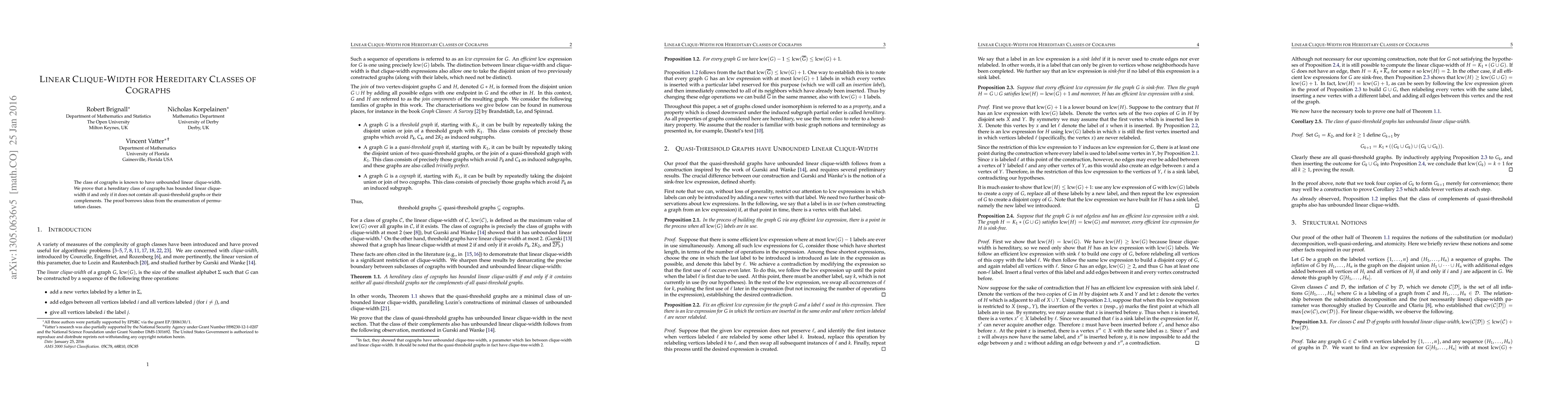 The research demonstrates that hereditary classes of cographs possess bounded linear clique-width only if they exclude all quasi-threshold graphs and their complements. The proof utilizes concepts from the enumeration of permutation classes.