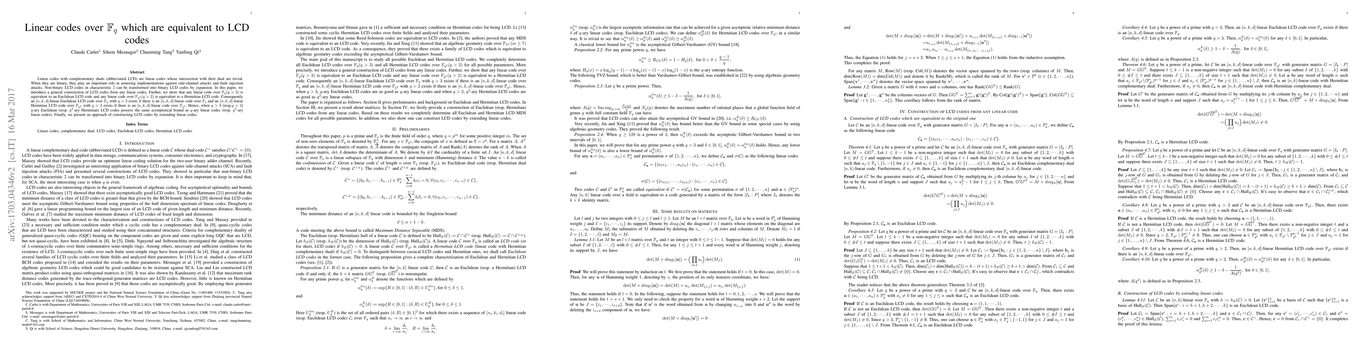 Linear codes with complementary duals (abbreviated LCD) are linear codes whose intersection with their dual are trivial. When they are binary, they play an important role in armoring implementations against side-channel attacks and fault injection attacks. Non-binary LCD codes in characteristic 2 can be transformed into binary LCD codes by expansion. In this paper, we introduce a general construction of LCD codes from any linear codes. Further, we show that any linear code over $\mathbb F_{q} (q>3)$ is equivalent to an Euclidean LCD code and any linear code over $\mathbb F_{q^2} (q>2)$ is equivalent to a Hermitian LCD code. Consequently an $[n,k,d]$-linear Euclidean LCD code over $\mathbb F_q$ with $q>3$ exists if there is an $[n,k,d]$-linear code over $\mathbb F_q$ and an $[n,k,d]$-linear Hermitian LCD code over $\mathbb F_{q^2}$ with $q>2$ exists if there is an $[n,k,d]$-linear code over $\mathbb F_{q^2}$. Hence, when $q>3$ (resp.$q>2$) $q$-ary Euclidean (resp. $q^2$-ary Hermitian) LCD codes possess the same asymptotical bound as $q$-ary linear codes (resp. $q^2$-ary linear codes). Finally, we present an approach of constructing LCD codes by extending linear codes.