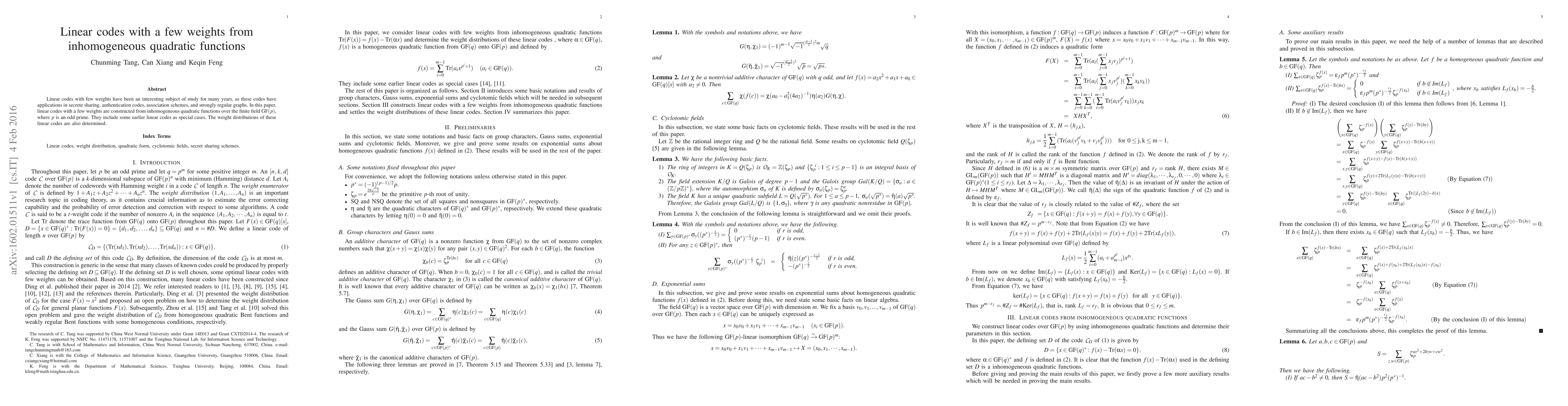 The paper presents a novel method for constructing linear codes with few weights using inhomogeneous quadratic functions, along with determining their weight distributions.