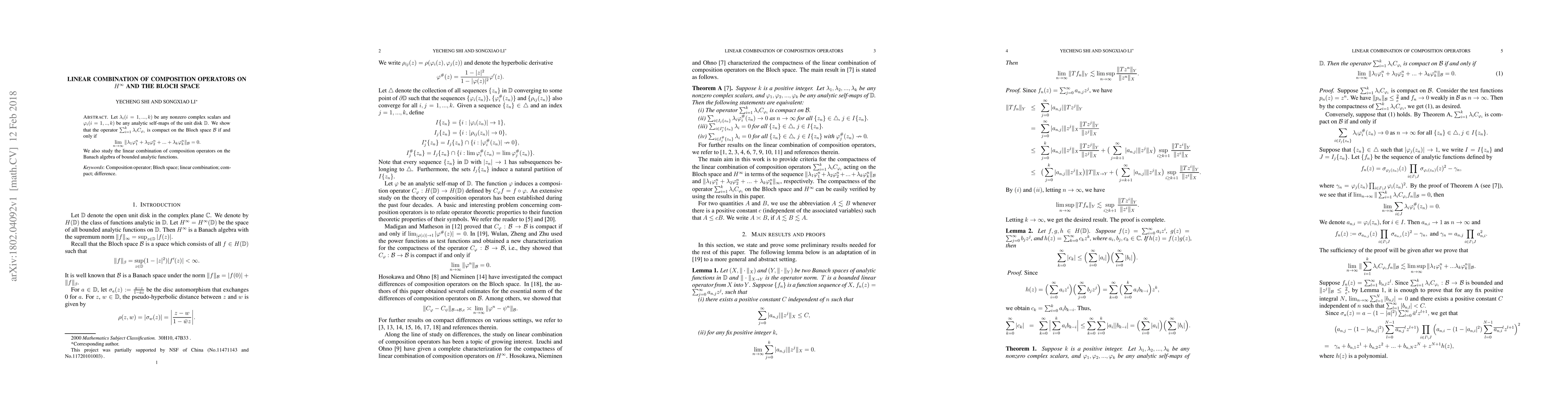 A linear combination of composition operators on H^{ty} and the Bloch space is compact if and only if a specific limit involving the scalars and analytic self-maps approaches zero.