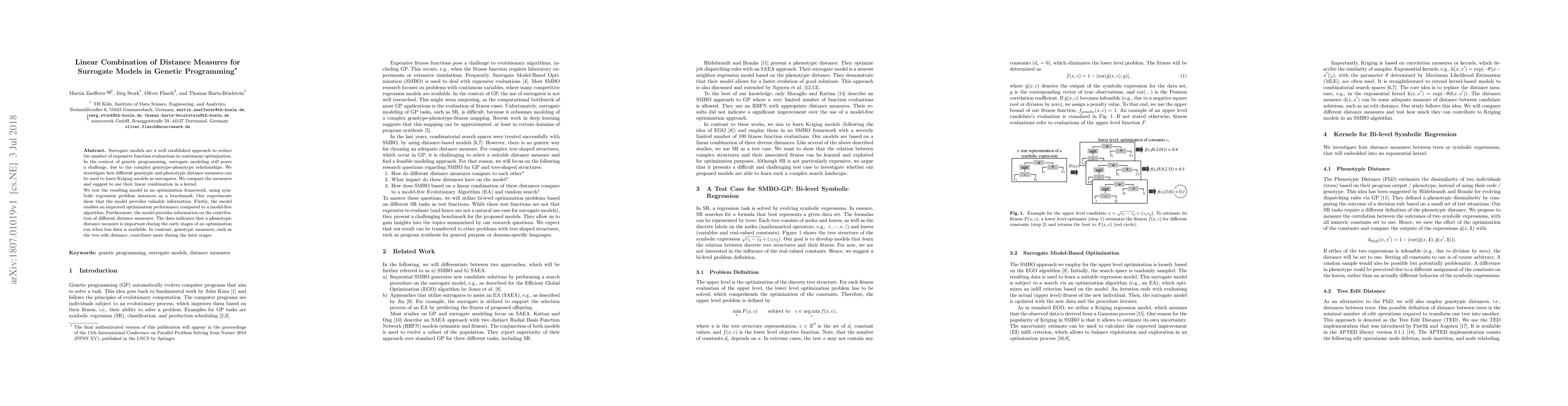 This paper explores the use of a linear combination of genotypic and phenotypic distance measures to enhance Kriging surrogate models in genetic programming. The study demonstrates that this approach improves optimization performance and highlights the importance of different distance measures at various stages of the optimization process.