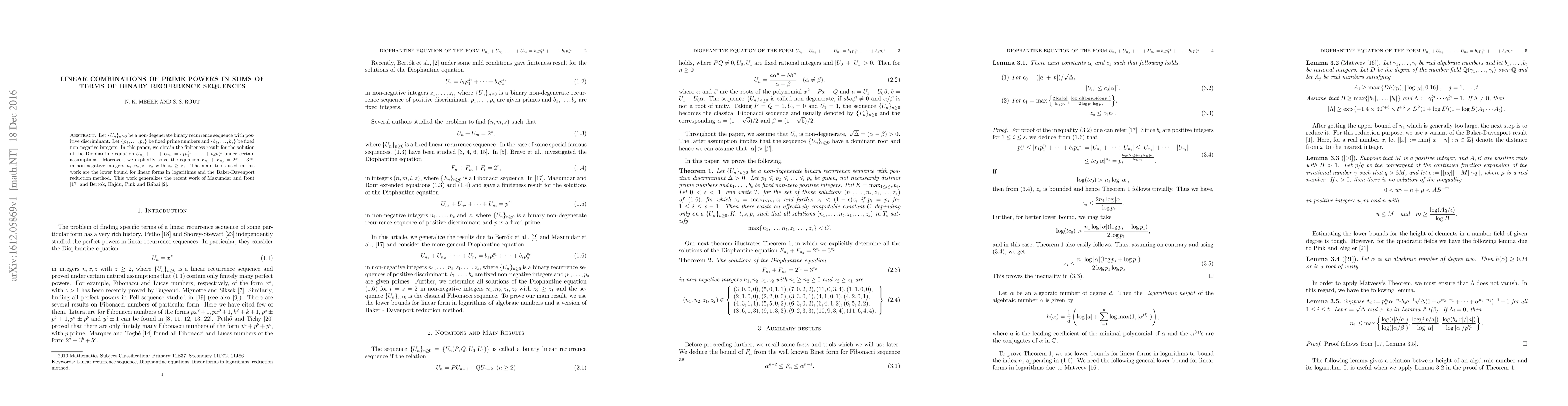 Researchers find a finiteness result for Diophantine equations involving binary recurrence sequences and prime powers, solving specific cases like $F_{n_1}+ F_{n_2}= 2^{z_1} +3^{z_2}$.