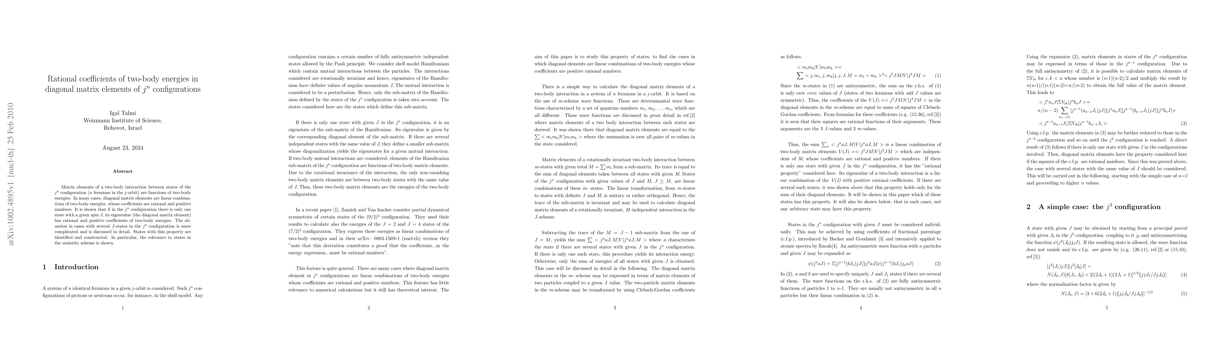 This paper investigates the matrix elements of two-body interactions in jn configurations, revealing that diagonal matrix elements are linear combinations of two-body energies with rational, non-negative coefficients that remain constant across different interactions. It also shows that when there is a single J-state in the jn configuration, its eigenvalue is a solvable linear combination of these energies.