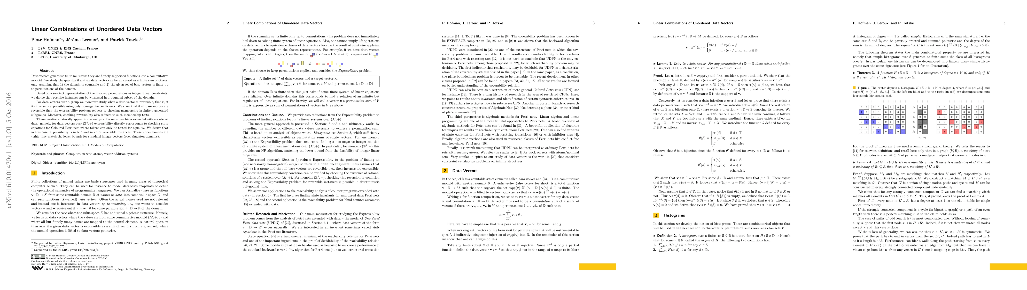 This paper investigates whether a given data vector can be expressed as a linear combination of other unordered data vectors under certain conditions. It establishes that expressibility can be witnessed in a bounded subset of the domain and shows that reversibility of data vectors over a group simplifies the problem to membership in finitely generated subgroups.