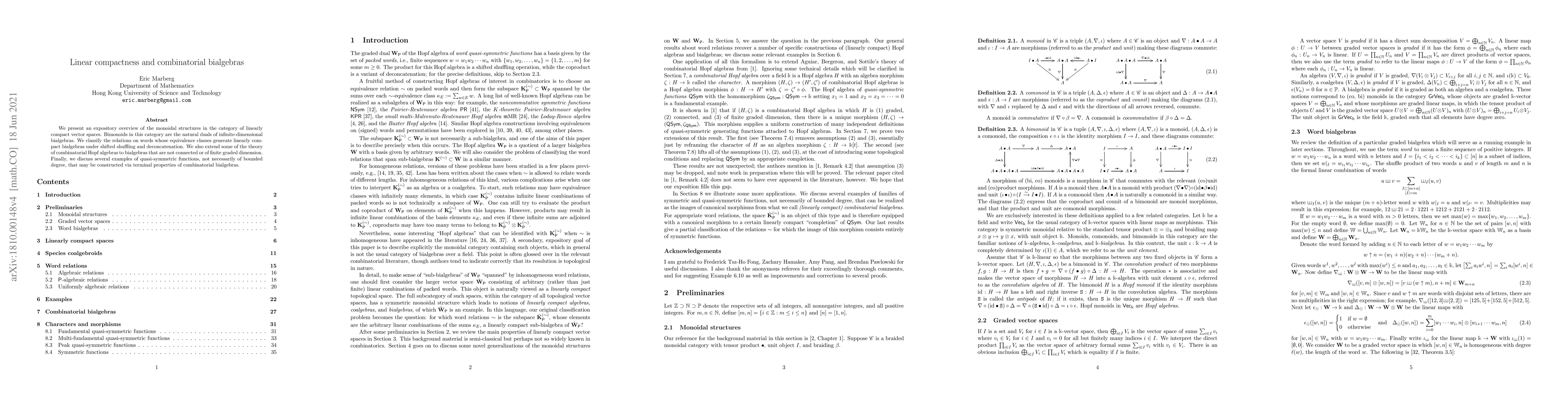 We present an expository overview of the monoidal structures in the category of linearly compact vector spaces. Bimonoids in this category are the natural duals of infinite-dimensional bialgebras. We classify the relations on words whose equivalence classes generate linearly compact bialgebras under shifted shuffling and deconcatenation. We also extend some of the theory of combinatorial Hopf algebras to bialgebras that are not connected or of finite graded dimension. Finally, we discuss several examples of quasi-symmetric functions, not necessarily of bounded degree, that may be constructed via terminal properties of combinatorial bialgebras.