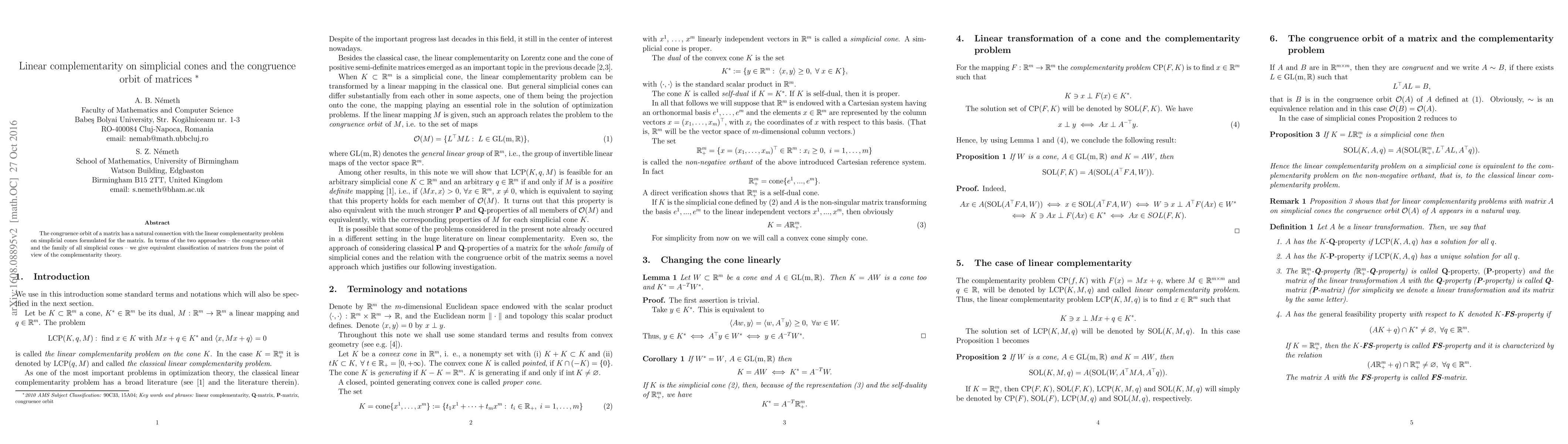 Summary: This paper explores the relationship between the congruence orbit of matrices and the linear complementarity problem on simplicial cones, providing an equivalent classification of matrices through both approaches.