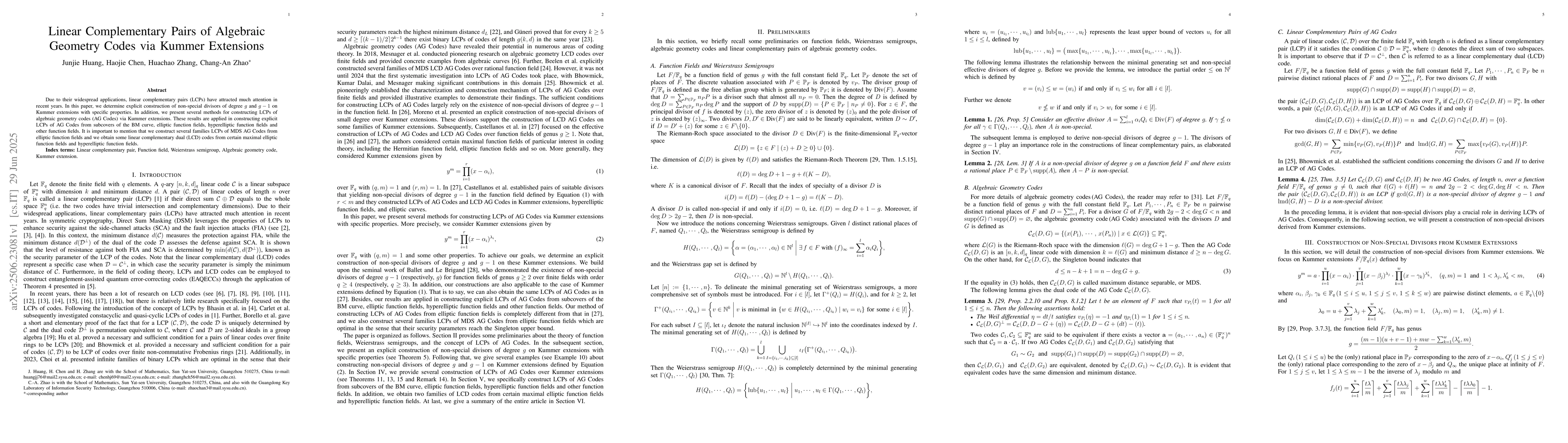Due to their widespread applications, linear complementary pairs (LCPs) have attracted much attention in recent years. In this paper, we determine explicit construction of non-special divisors of degree $g$ and $g-1$ on Kummer extensions with specific properties. In addition, we present several methods for constructing LCPs of algebraic geometry codes (AG Codes) via Kummer extensions. These results are applied in constructing explicit LCPs of AG Codes from subcovers of the BM curve, elliptic function fields, hyperelliptic function fields and other function fields. It is important to mention that we construct several families LCPs of MDS AG Codes from elliptic function fields and we obtain some linear complementary dual (LCD) codes from certain maximal elliptic function fields and hyperelliptic function fields.