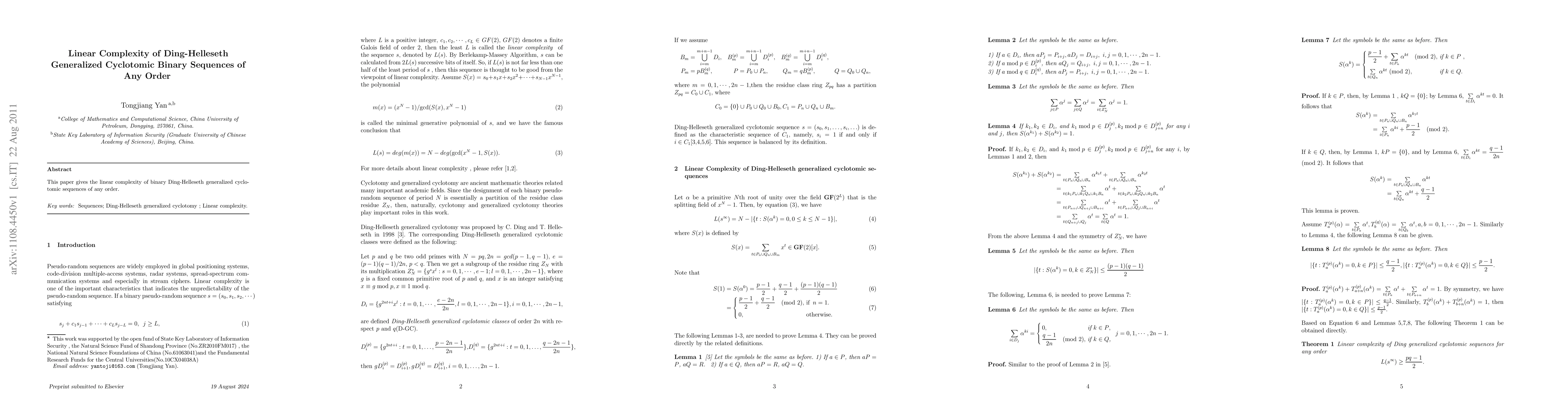 Summary: This paper determines the linear complexity for binary Ding-Helleseth generalized cyclotomic sequences of any order, providing a comprehensive analysis of their algebraic structure. The findings enhance the understanding of these sequences' applications in coding theory and cryptography.