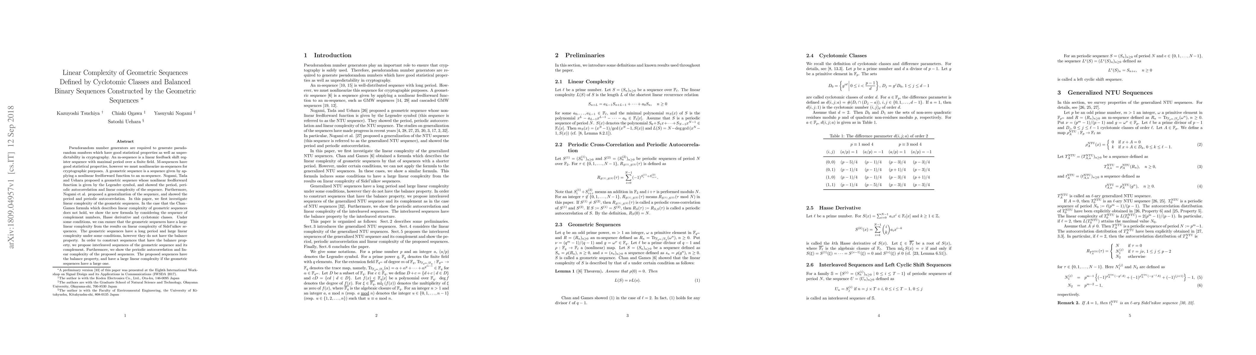 Pseudorandom number generators are required to generate pseudorandom numbers which have good statistical properties as well as unpredictability in cryptography. An m-sequence is a linear feedback shift register sequence with maximal period over a finite field. M-sequences have good statistical properties, however we must nonlinearize m-sequences for cryptographic purposes. A geometric sequence is a sequence given by applying a nonlinear feedforward function to an m-sequence. Nogami, Tada and Uehara proposed a geometric sequence whose nonlinear feedforward function is given by the Legendre symbol, and showed the period, periodic autocorrelation and linear complexity of the sequence. Furthermore, Nogami et al. proposed a generalization of the sequence, and showed the period and periodic autocorrelation. In this paper, we first investigate linear complexity of the geometric sequences. In the case that the Chan--Games formula which describes linear complexity of geometric sequences does not hold, we show the new formula by considering the sequence of complement numbers, Hasse derivative and cyclotomic classes. Under some conditions, we can ensure that the geometric sequences have a large linear complexity from the results on linear complexity of Sidel'nikov sequences. The geometric sequences have a long period and large linear complexity under some conditions, however they do not have the balance property. In order to construct sequences that have the balance property, we propose interleaved sequences of the geometric sequence and its complement. Furthermore, we show the periodic autocorrelation and linear complexity of the proposed sequences. The proposed sequences have the balance property, and have a large linear complexity if the geometric sequences have a large one.