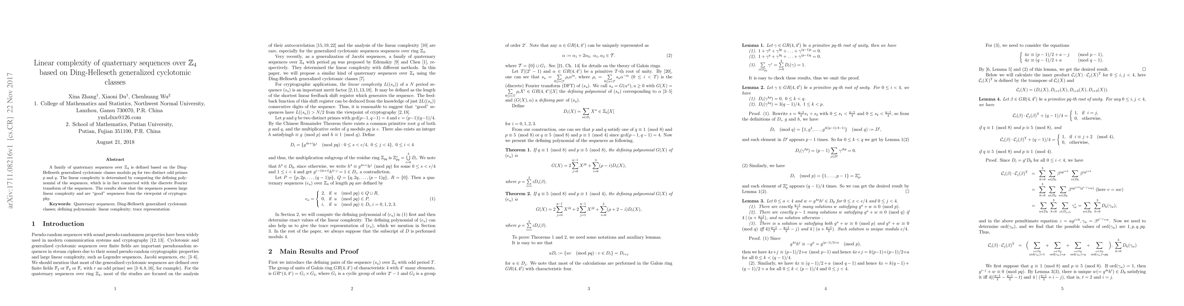 This paper defines a family of quaternary sequences over Z4 based on Ding-Helleseth generalized cyclotomic classes. The linear complexity is determined through the defining polynomial, revealing large complexity and strong cryptographic properties.