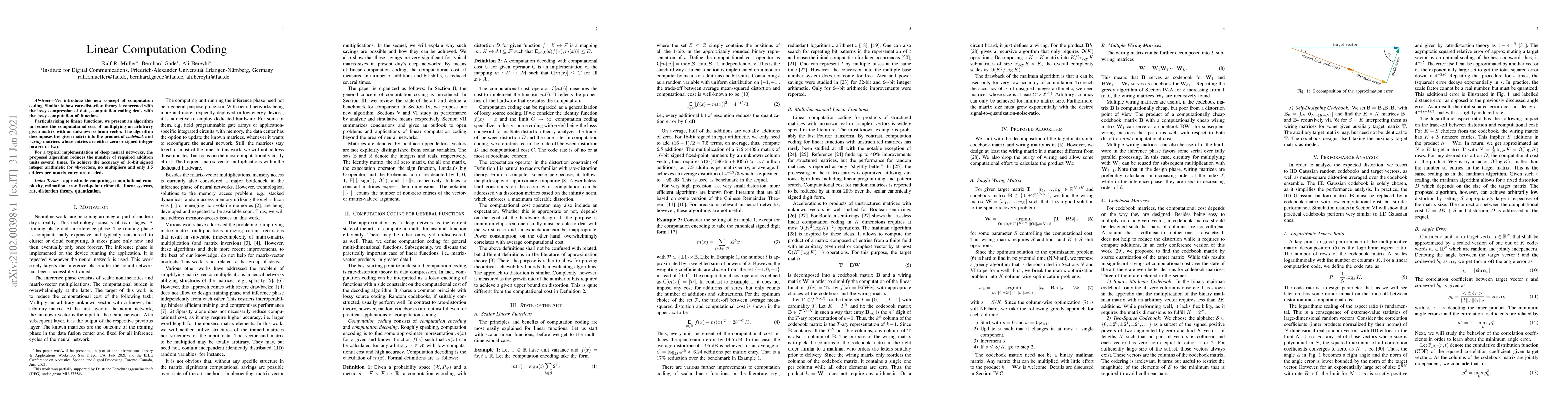We introduce the new concept of computation coding. Similar to how rate-distortion theory is concerned with the lossy compression of data, computation coding deals with the lossy computation of functions. Particularizing to linear functions, we present an algorithm to reduce the computational cost of multiplying an arbitrary given matrix with an unknown column vector. The algorithm decomposes the given matrix into the product of codebook wiring matrices whose entries are either zero or signed integer powers of two. For a typical implementation of deep neural networks, the proposed algorithm reduces the number of required addition units several times. To achieve the accuracy of 16-bit signed integer arithmetic for 4k-vectors, no multipliers and only 1.5 adders per matrix entry are needed.