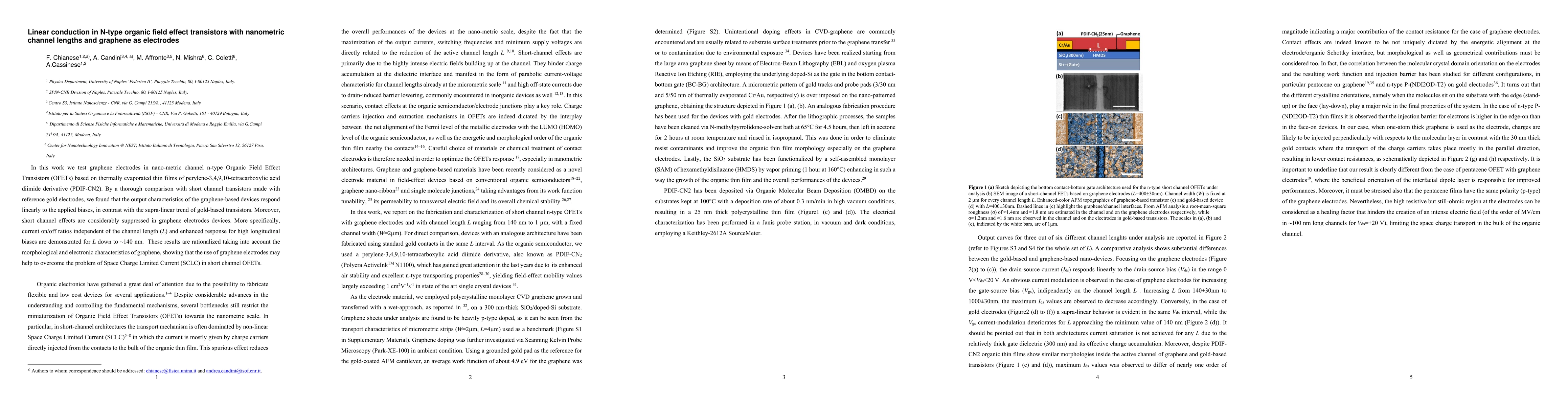 Graphene-based organic field effect transistors with nanometric channel lengths exhibit linear conduction behavior, suppressing short-channel effects compared to gold electrodes.