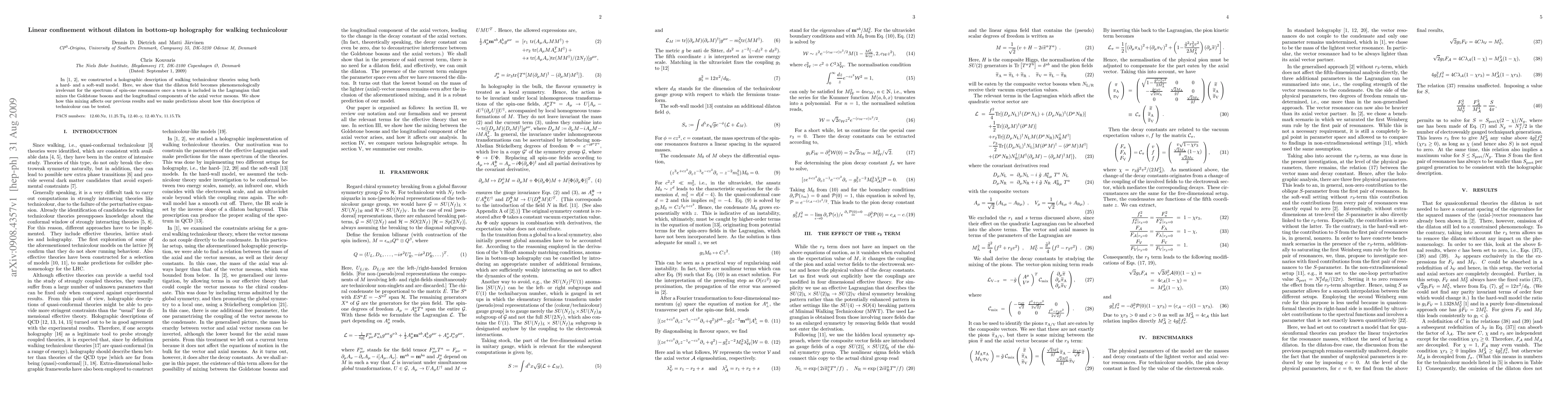 In PRD78(2008)055005 [arXiv:0805.1503 [hep-ph]] and PRD79(2009)075004 [arXiv:0809.1324 [hep-ph]], we constructed a holographic description of walking technicolour theories using both a hard- and a soft-wall model. Here, we show that the dilaton field becomes phenomenologically irrelevant for the spectrum of spin-one resonances once a term is included in the Lagrangian that mixes the Goldstone bosons and the longitudinal components of the axial vector mesons. We show how this mixing affects our previous results and we make predictions about how this description of technicolour can be tested.