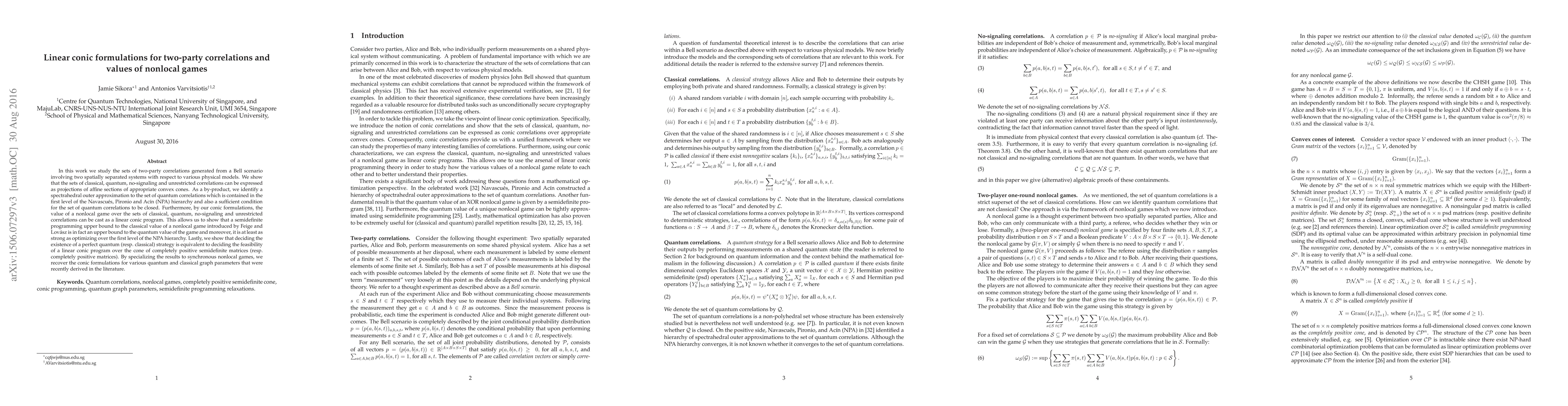 This paper explores linear conic formulations for two-party correlations in Bell scenarios, showing that classical, quantum, no-signaling, and unrestricted correlations can be represented as projections of affine sections of convex cones. It also establishes a spectrahedral outer approximation to quantum correlations and demonstrates that the value of nonlocal games can be computed via linear conic programs.