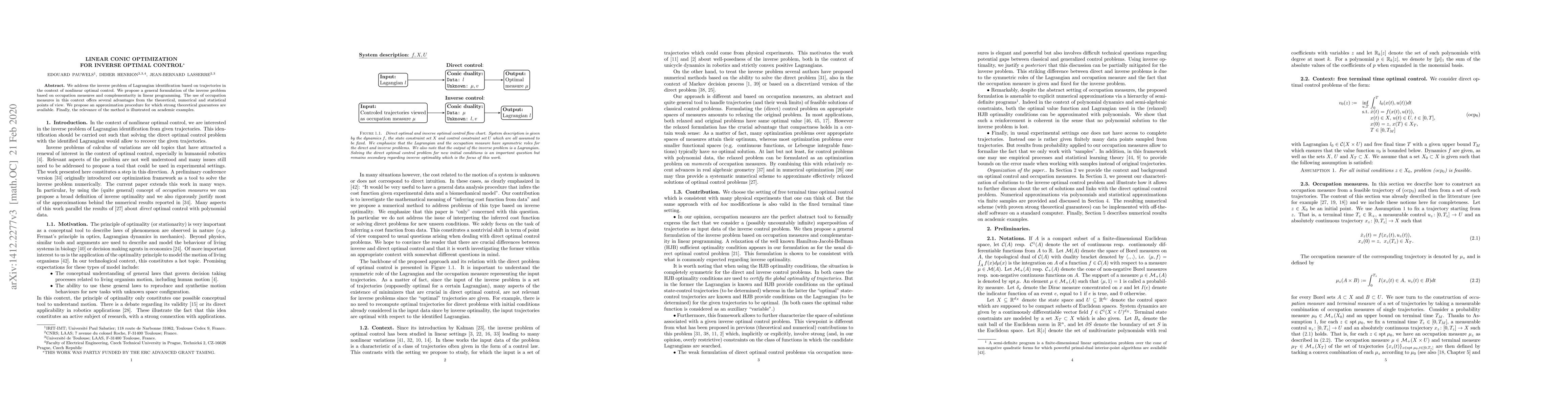 We address the inverse problem of Lagrangian identification based on trajecto-ries in the context of nonlinear optimal control. We propose a general formulation of the inverse problem based on occupation measures and complementarity in linear programming. The use of occupation measures in this context offers several advan-tages from the theoretical, numerical and statistical points of view. We propose an approximation procedure for which strong theoretical guarantees are available. Finally, the relevance of the method is illustrated on academic examples.