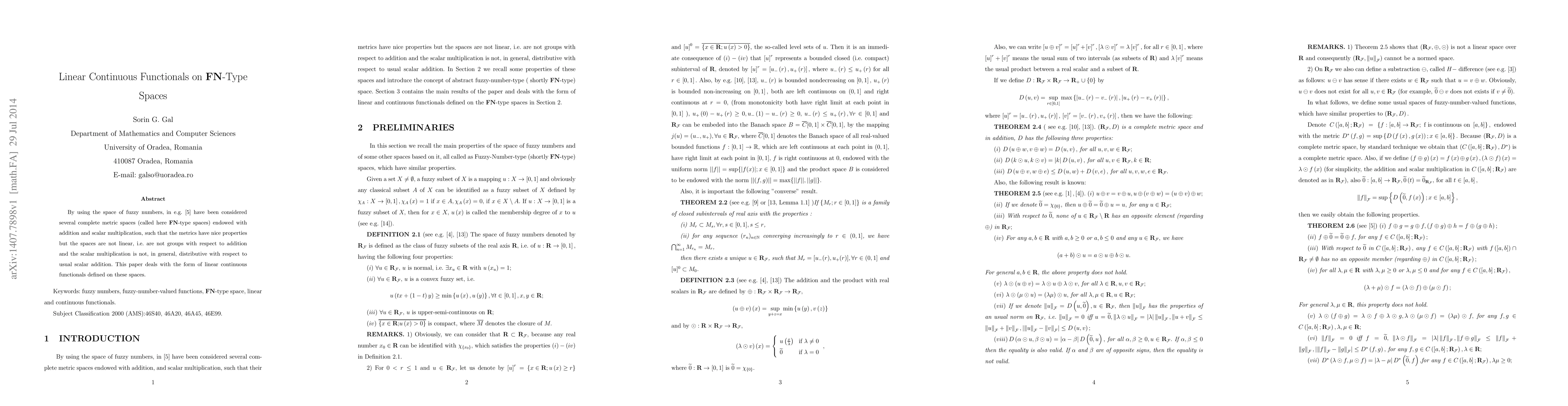 By using the space of fuzzy numbers, in e.g. [5] have been considered several complete metric spaces (called here {\bf FN}-type spaces) endowed with addition and scalar multiplication, such that the metrics have nice properties but the spaces are not linear, i.e. are not groups with respect to addition and the scalar multiplication is not, in general, distributive with respect to usual scalar addition. This paper deals with the form of linear continuous functionals defined on these spaces.