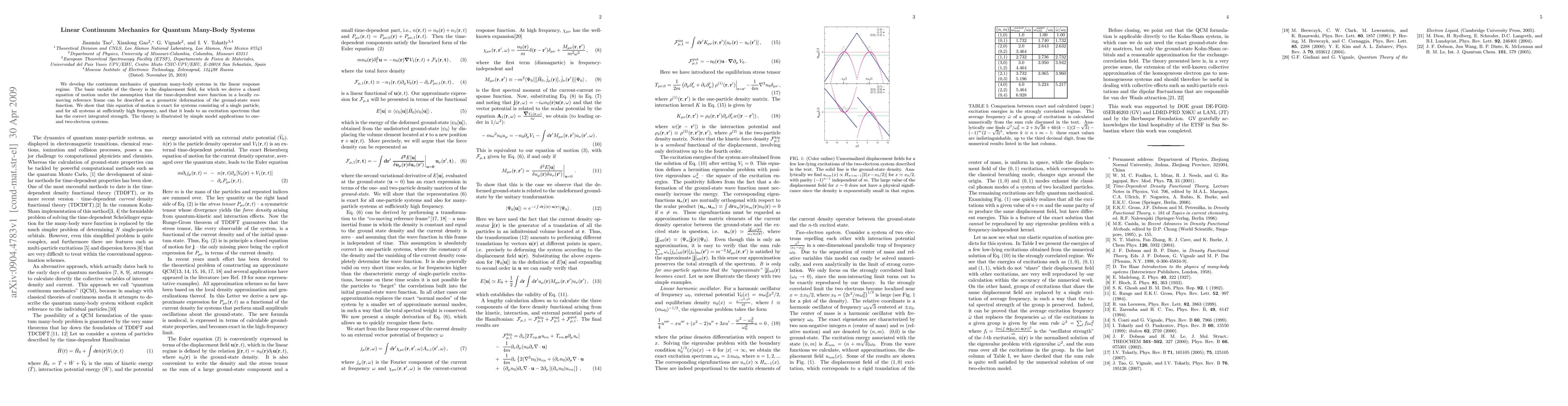 We develop the continuum mechanics of quantum many-body systems in the linear response regime. The basic variable of the theory is the displacement field, for which we derive a closed equation of motion under the assumption that the time-dependent wave function in a locally co-moving reference frame can be described as a geometric deformation of the ground-state wave function. We show that this equation of motion is exact for systems consisting of a single particle, and for all systems at sufficiently high frequency, and that it leads to an excitation spectrum that has the correct integrated strength. The theory is illustrated by simple model applications to one- and two-electron systems.