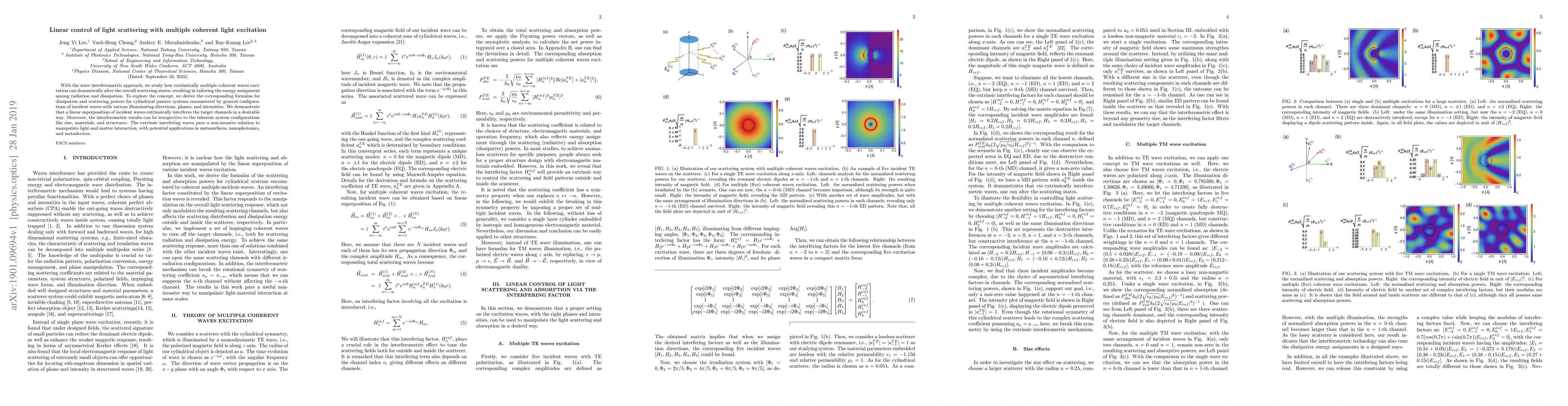 This paper investigates how multiple coherent light waves can be used to control light scattering through wave interferometric approaches, demonstrating that linear superposition of incident waves can tailor energy distribution between radiation and dissipation. The study provides formulas for dissipation and scattering powers for cylindrical passive systems, showing that the interferometric results are independent of system configurations, offering a non-invasive method to manipulate light-matter interactions with applications in metasurfaces, nanophotonics, and metadevices.