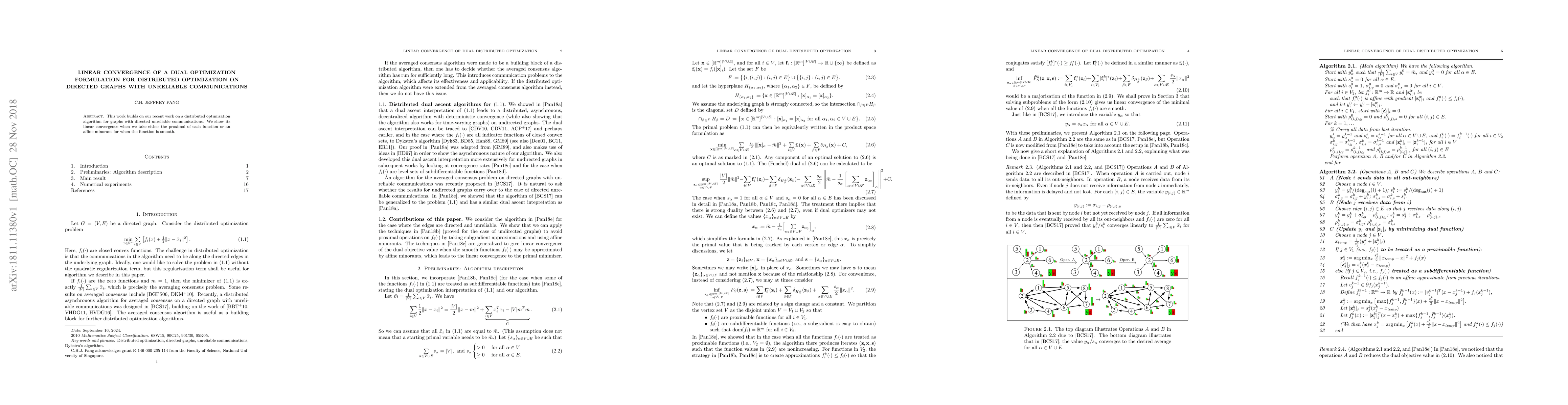 A distributed optimization algorithm for directed graphs with unreliable communications achieves linear convergence when using either a proximal or affine minorant approximation of the objective function.