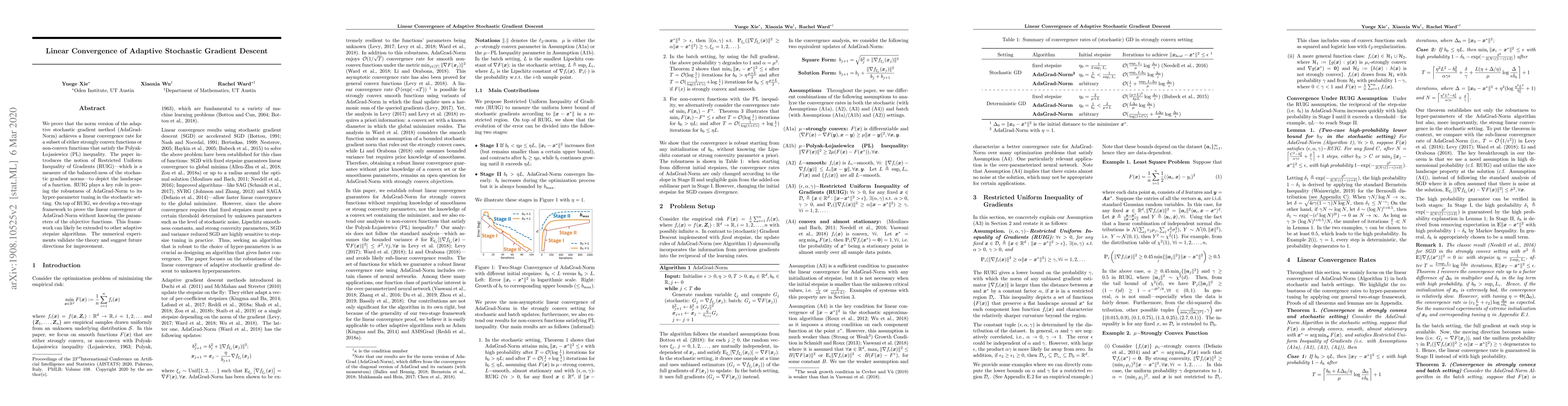 We prove that the norm version of the adaptive stochastic gradient method (AdaGrad-Norm) achieves a linear convergence rate for a subset of either strongly convex functions or non-convex functions that satisfy the Polyak Lojasiewicz (PL) inequality. The paper introduces the notion of Restricted Uniform Inequality of Gradients (RUIG)---which is a measure of the balanced-ness of the stochastic gradient norms---to depict the landscape of a function. RUIG plays a key role in proving the robustness of AdaGrad-Norm to its hyper-parameter tuning in the stochastic setting. On top of RUIG, we develop a two-stage framework to prove the linear convergence of AdaGrad-Norm without knowing the parameters of the objective functions. This framework can likely be extended to other adaptive stepsize algorithms. The numerical experiments validate the theory and suggest future directions for improvement.