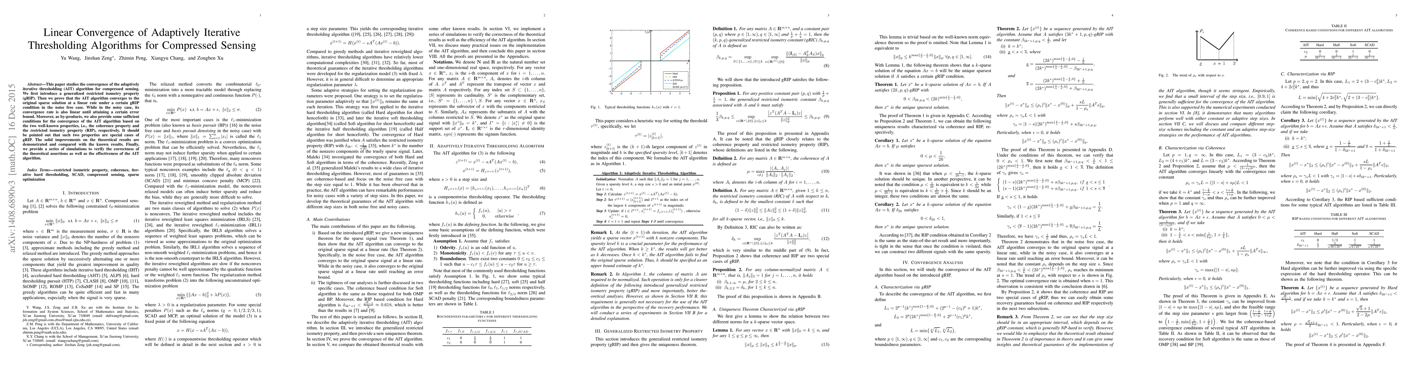 This paper investigates the adaptively iterative thresholding (AIT) algorithm for compressed sensing, proving its linear convergence under a generalized restricted isometry property (gRIP) in both noise-free and noisy scenarios. It also provides sufficient conditions for convergence based on coherence and restricted isometry properties.