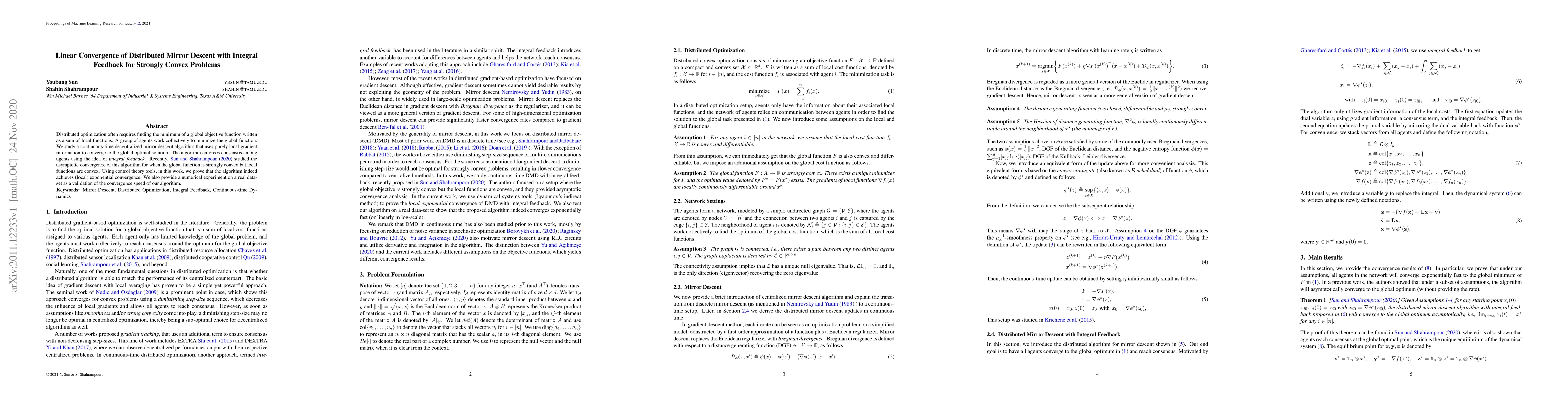 This paper studies a continuous-time decentralized mirror descent algorithm with integral feedback for minimizing strongly convex global functions composed of local components. The authors prove linear convergence and validate the algorithm's speed through numerical experiments on real data.