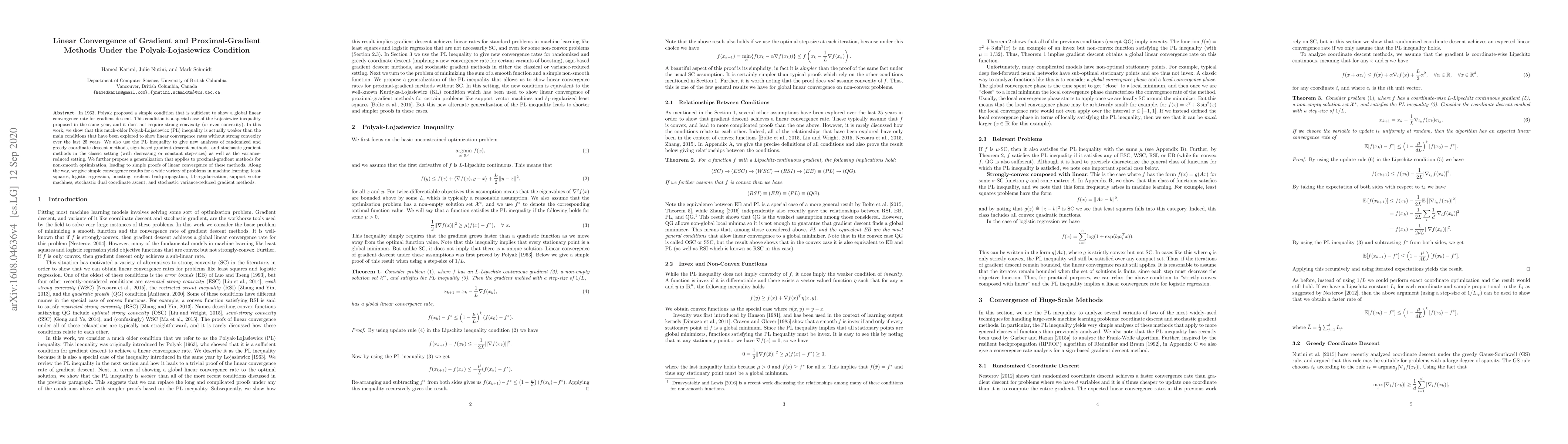 In 1963, Polyak proposed a simple condition that is sufficient to show a global linear convergence rate for gradient descent. This condition is a special case of the \L{}ojasiewicz inequality proposed in the same year, and it does not require strong convexity (or even convexity). In this work, we show that this much-older Polyak-\L{}ojasiewicz (PL) inequality is actually weaker than the main conditions that have been explored to show linear convergence rates without strong convexity over the last 25 years. We also use the PL inequality to give new analyses of randomized and greedy coordinate descent methods, sign-based gradient descent methods, and stochastic gradient methods in the classic setting (with decreasing or constant step-sizes) as well as the variance-reduced setting. We further propose a generalization that applies to proximal-gradient methods for non-smooth optimization, leading to simple proofs of linear convergence of these methods. Along the way, we give simple convergence results for a wide variety of problems in machine learning: least squares, logistic regression, boosting, resilient backpropagation, L1-regularization, support vector machines, stochastic dual coordinate ascent, and stochastic variance-reduced gradient methods.