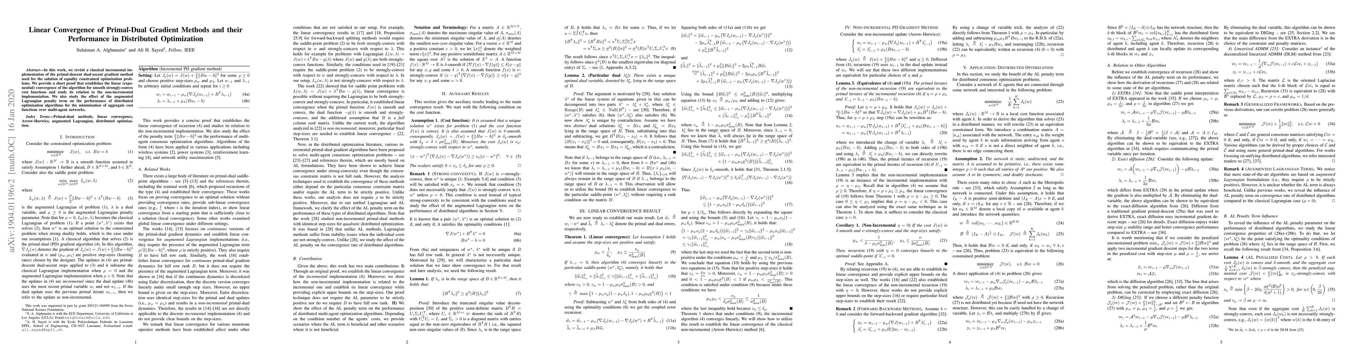 In this work, we revisit a classical incremental implementation of the primal-descent dual-ascent gradient method used for the solution of equality constrained optimization problems. We provide a short proof that establishes the linear (exponential) convergence of the algorithm for smooth strongly-convex cost functions and study its relation to the non-incremental implementation. We also study the effect of the augmented Lagrangian penalty term on the performance of distributed optimization algorithms for the minimization of aggregate cost functions over multi-agent networks.