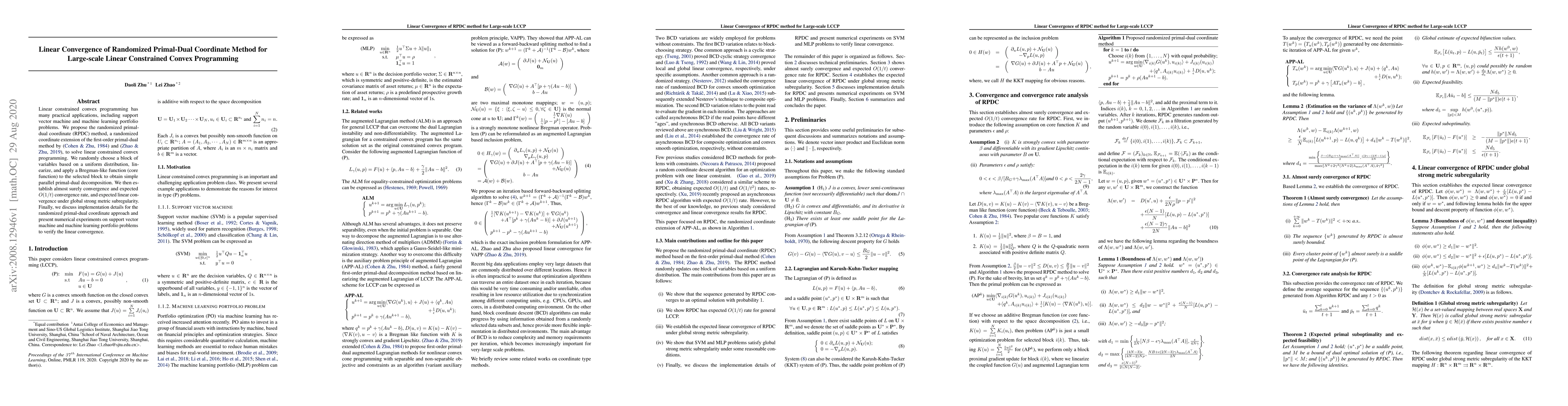 This paper proposes a randomized primal-dual coordinate method (RPDC) for solving large-scale linear constrained convex programming, achieving almost sure convergence and expected linear convergence under certain conditions. Numerical experiments on support vector machines and machine learning portfolio problems demonstrate the method's effectiveness.